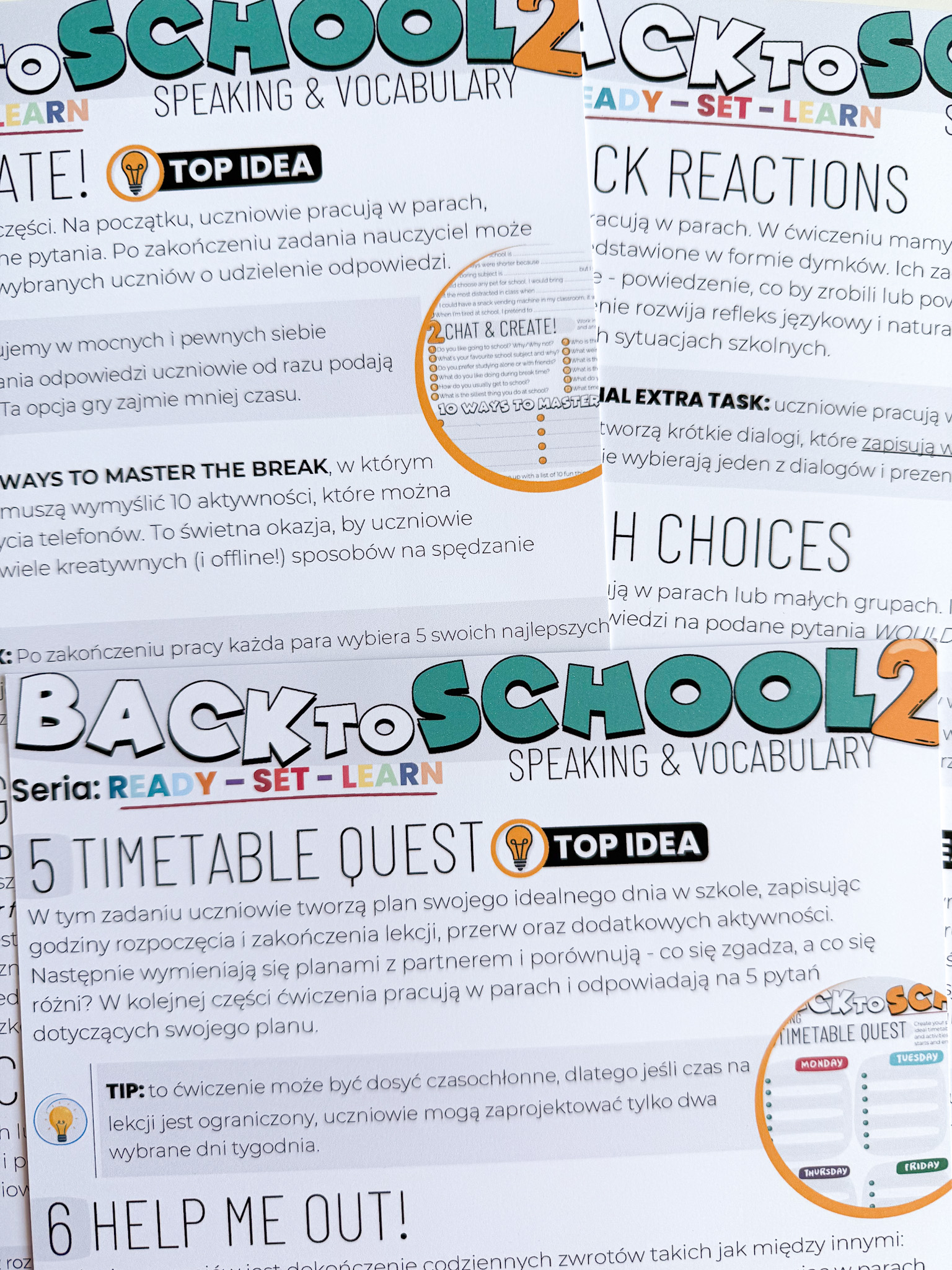 • Back To School: Speaking – to 11 kart pracy, które zawierają ćwiczenia typu pairwork, dialogi, zadania na opisywanie zdjęć, reakcje językowe, uzupełnianie luk czy angażującą grę Guess it -zadania rozwijają umiejętność swobodnej wypowiedzi i przygotowują uczniów do egzaminu ósmoklasisty. Każda karta to inny format – uczniowie się nie nudzą!