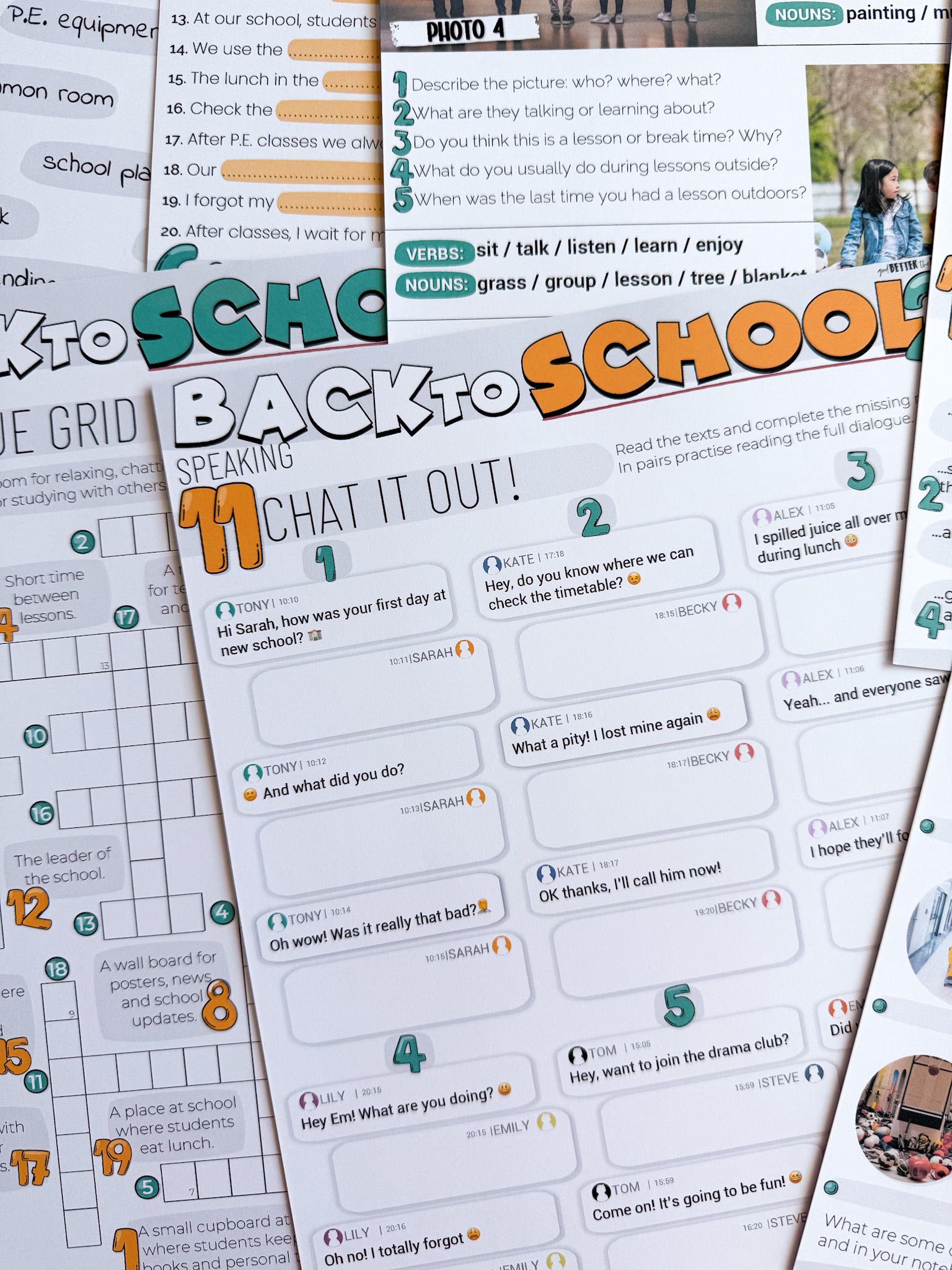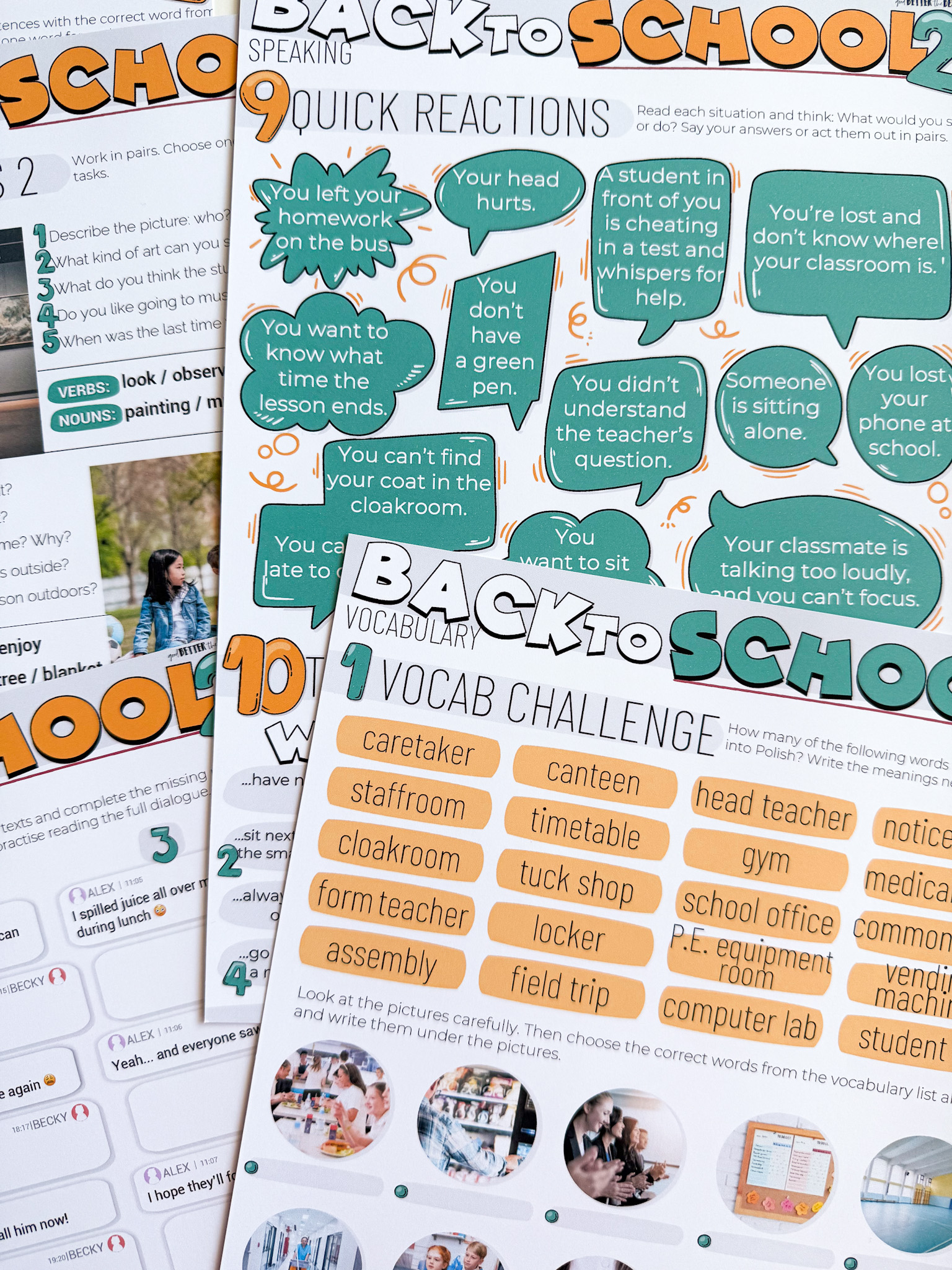 • Back To School: Vocabulary – to 5 stron angażujących ćwiczeń leksykalnych związanych ze szkołą: od kategorii słownictwa i dopasowań, po tłumaczenia i krzyżówkę z hasłem. Zadania rozwijają pamięć leksykalną i precyzję językową.