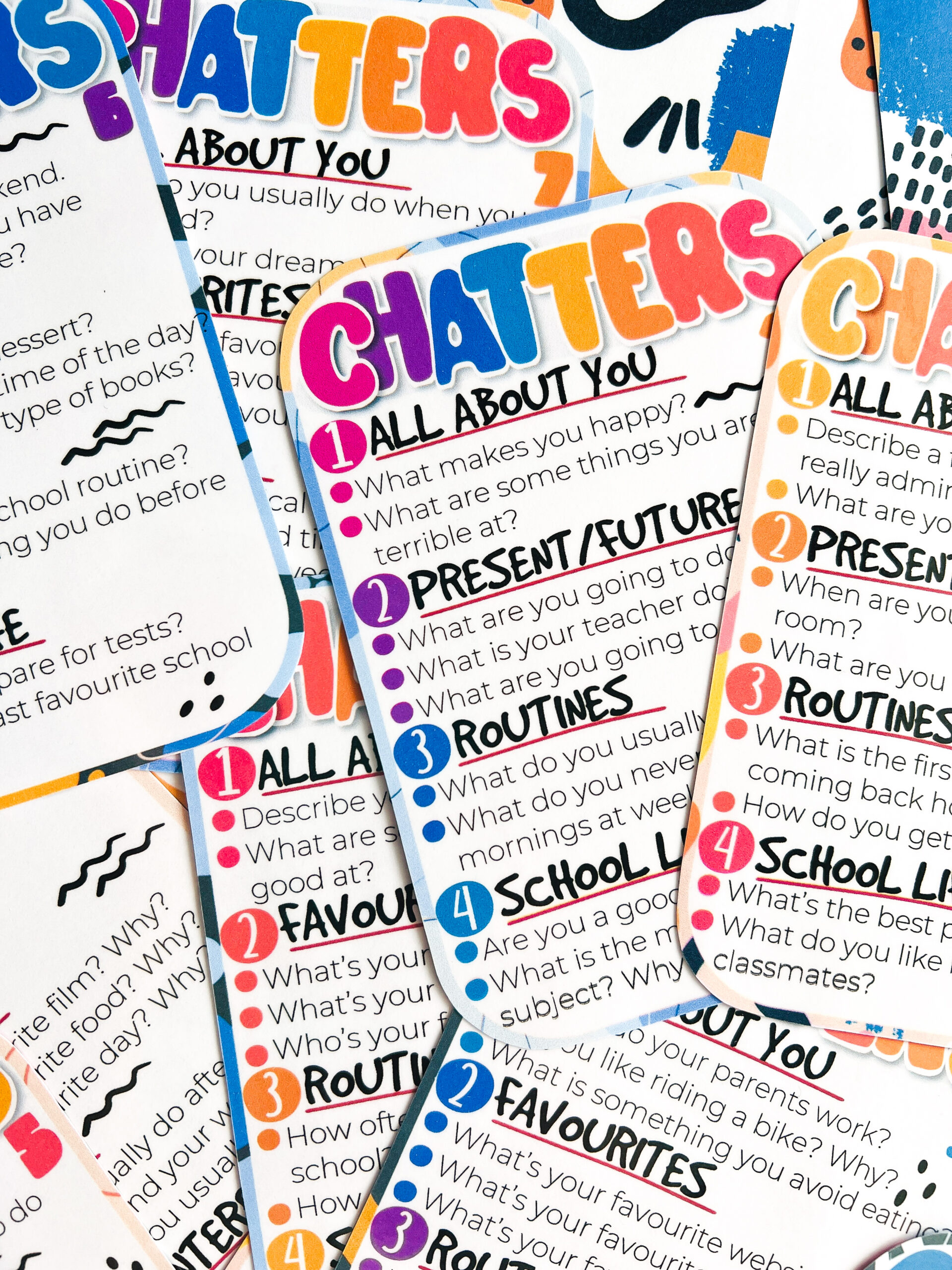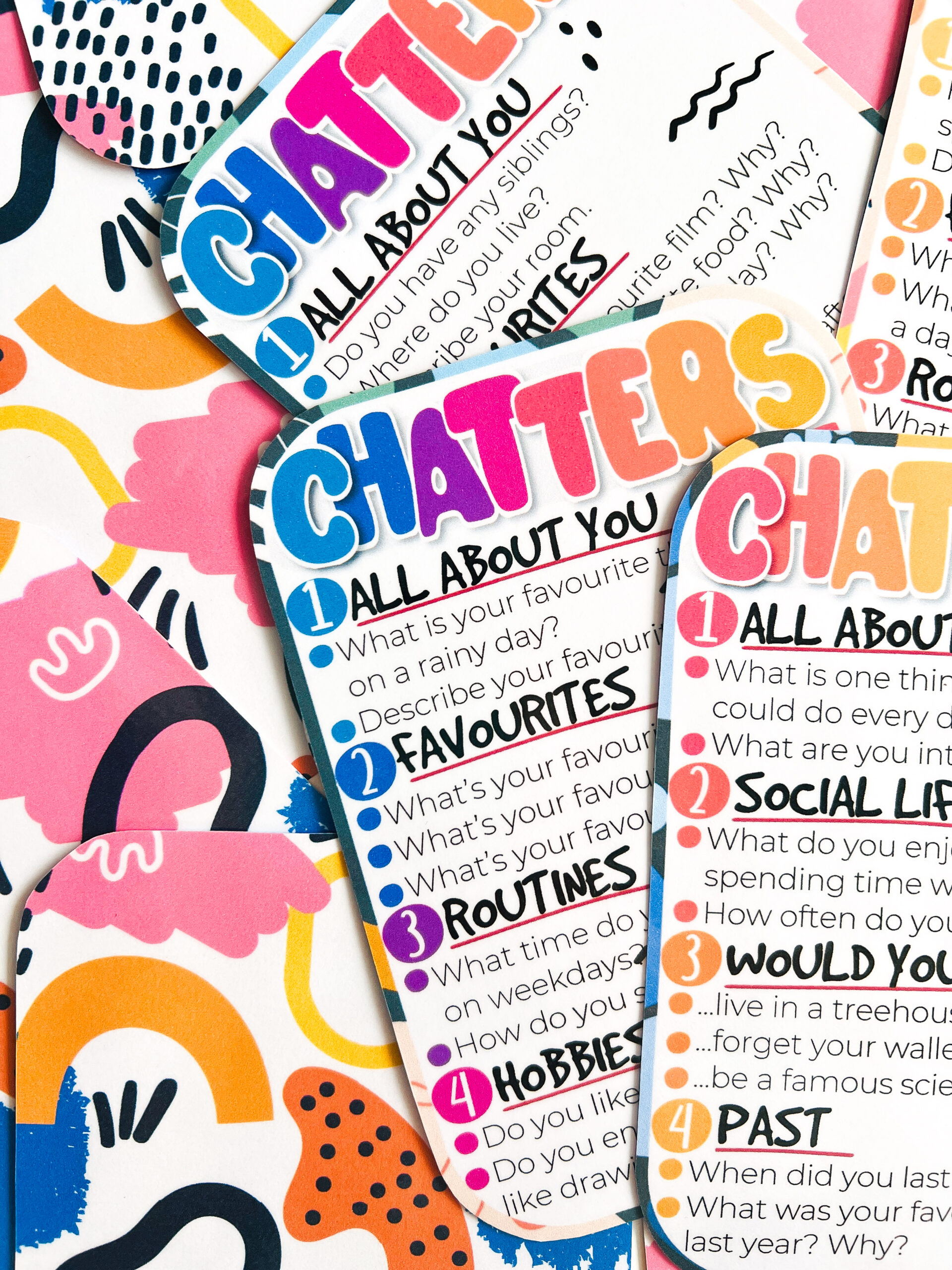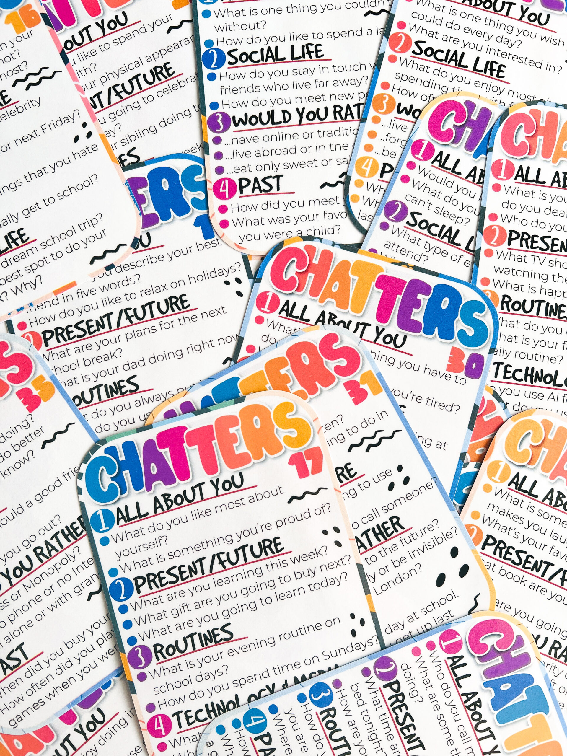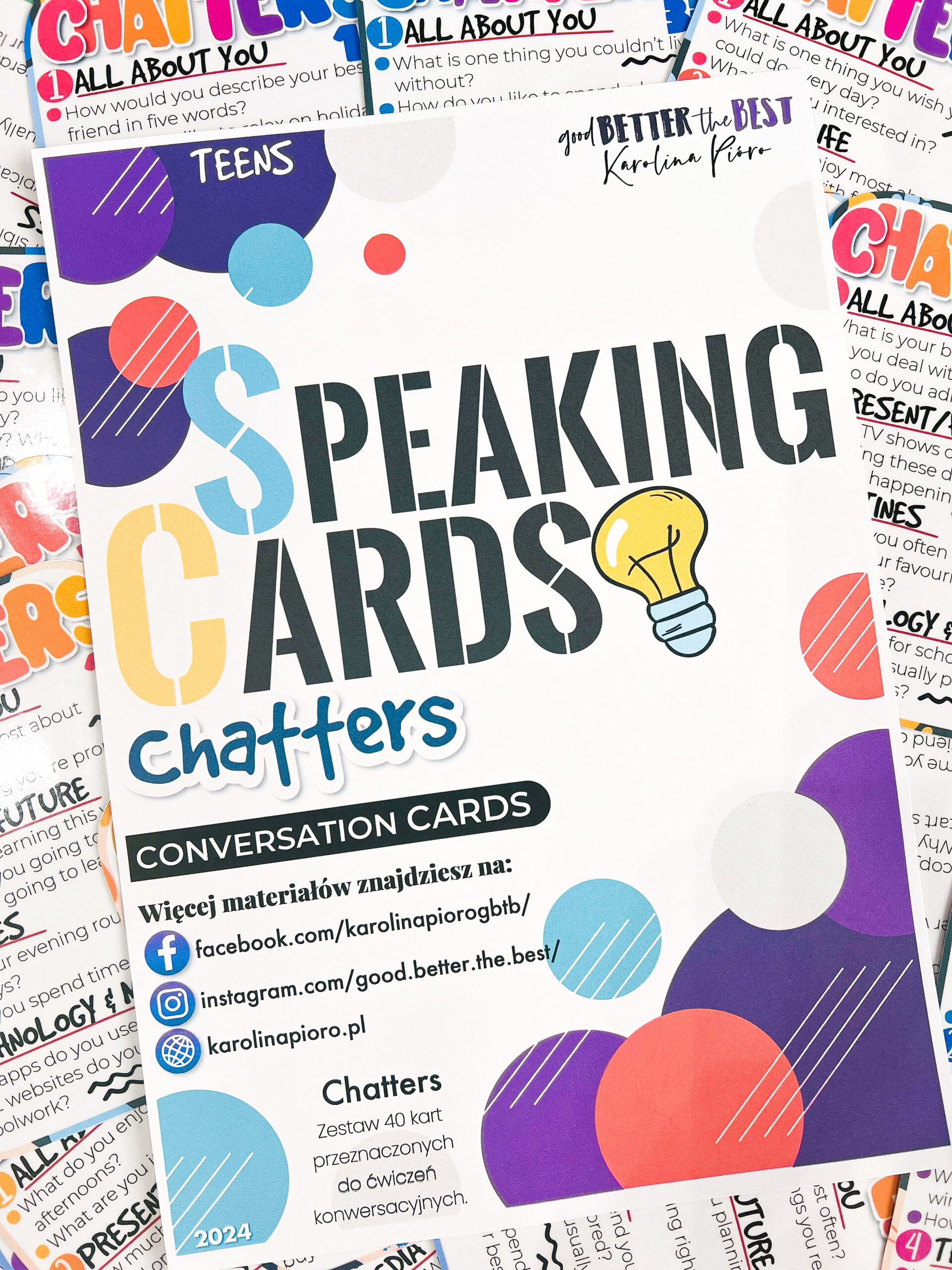 CHATTERS to zestaw 40 kart konwersacyjnych, które zawierają łącznie 347 pytań, zaprojektowanych z myślą o uczniach i nauczycielach. Jest on przeznaczony głównie dla starszych klas szkoły podstawowej, czyli dla uczniów, którzy zaczynają nabierać pewności w posługiwaniu się językiem angielskim i chcą rozwijać swoje umiejętności komunikacyjne.