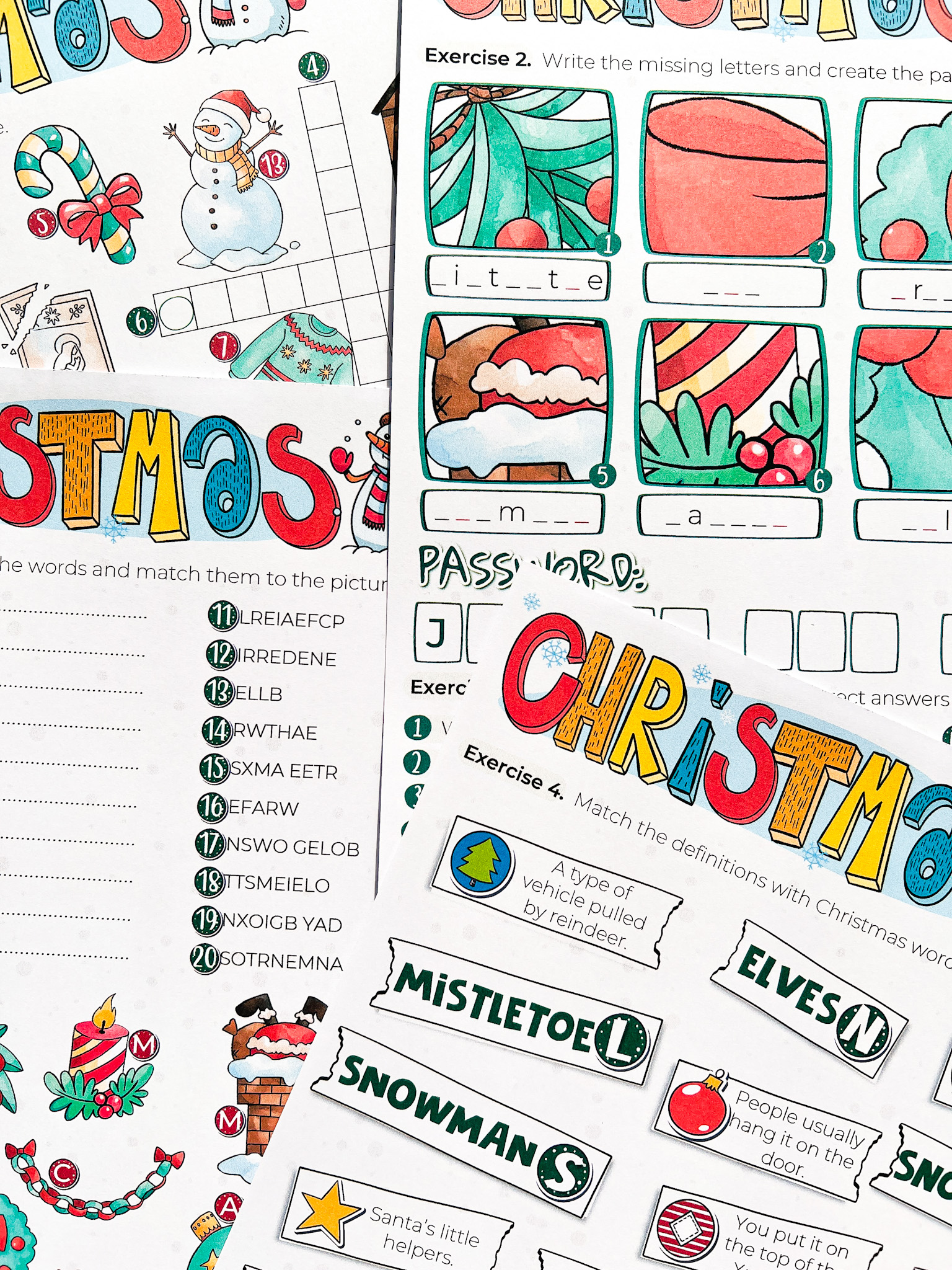 🎄 Grammar: 18 stron kart pracy, które pomogą uczniom opanować lub powtórzyć główne zagadnienia gramatyczne w świątecznym stylu.