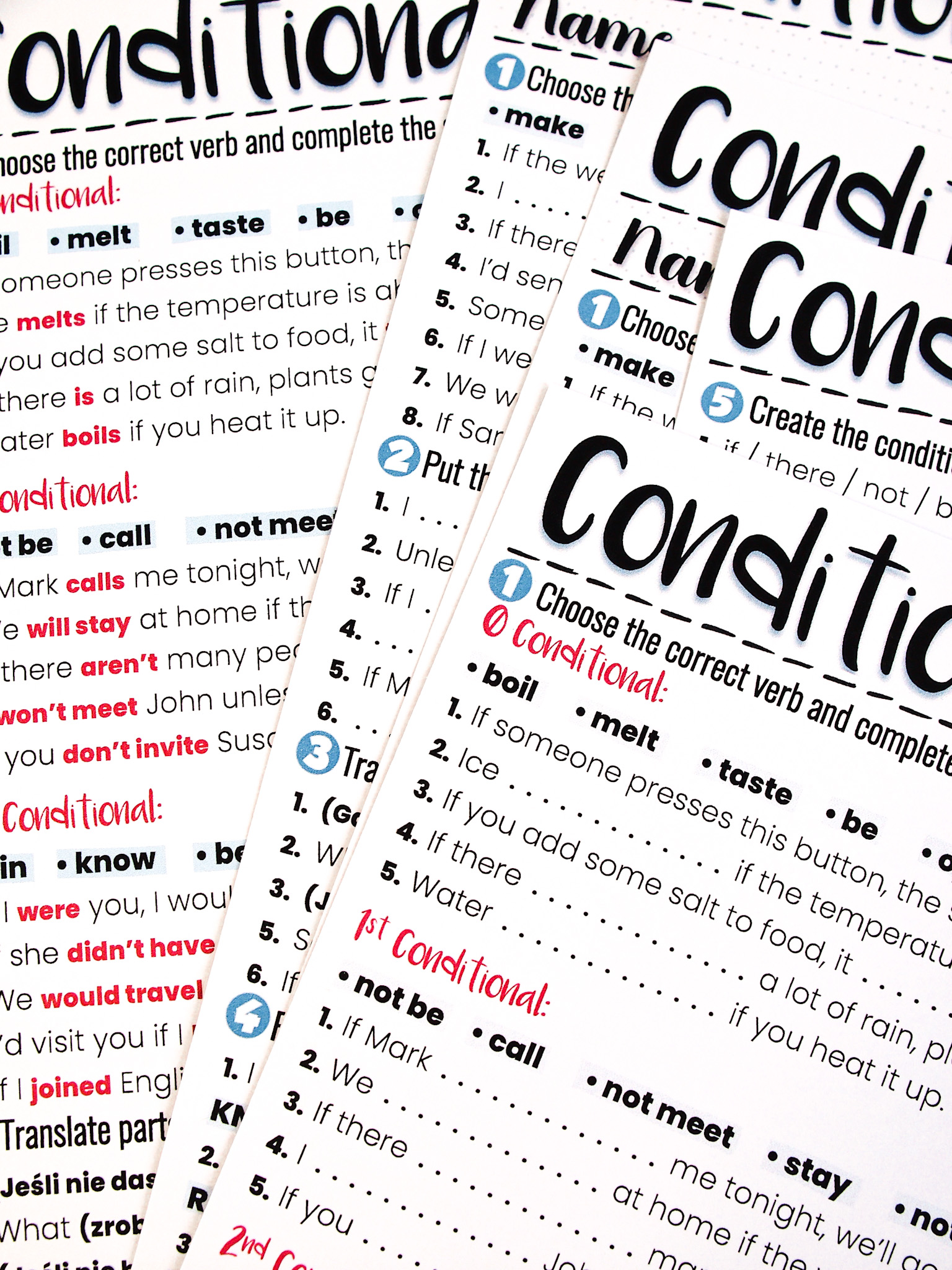 Conditionals Revision Resource Book– zestaw przeznaczony do pracy z uczniami klas starszych szkoły podstawowej oraz innymi na poziomie A1+/A2/B1. W zestawie e-book z ćwiczeniami dla ucznia, książka z naniesionymi odpowiedziami dla nauczyciela, 4 gry oraz tło. E-book obejmuje: 0/1st/2nd Conditional. Po zakupie wysyłany jest plik PDF do samodzielnego wydruku.