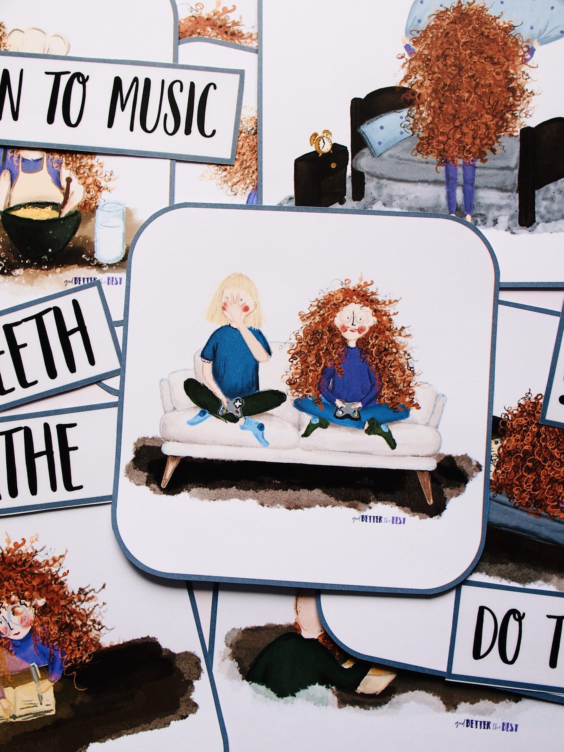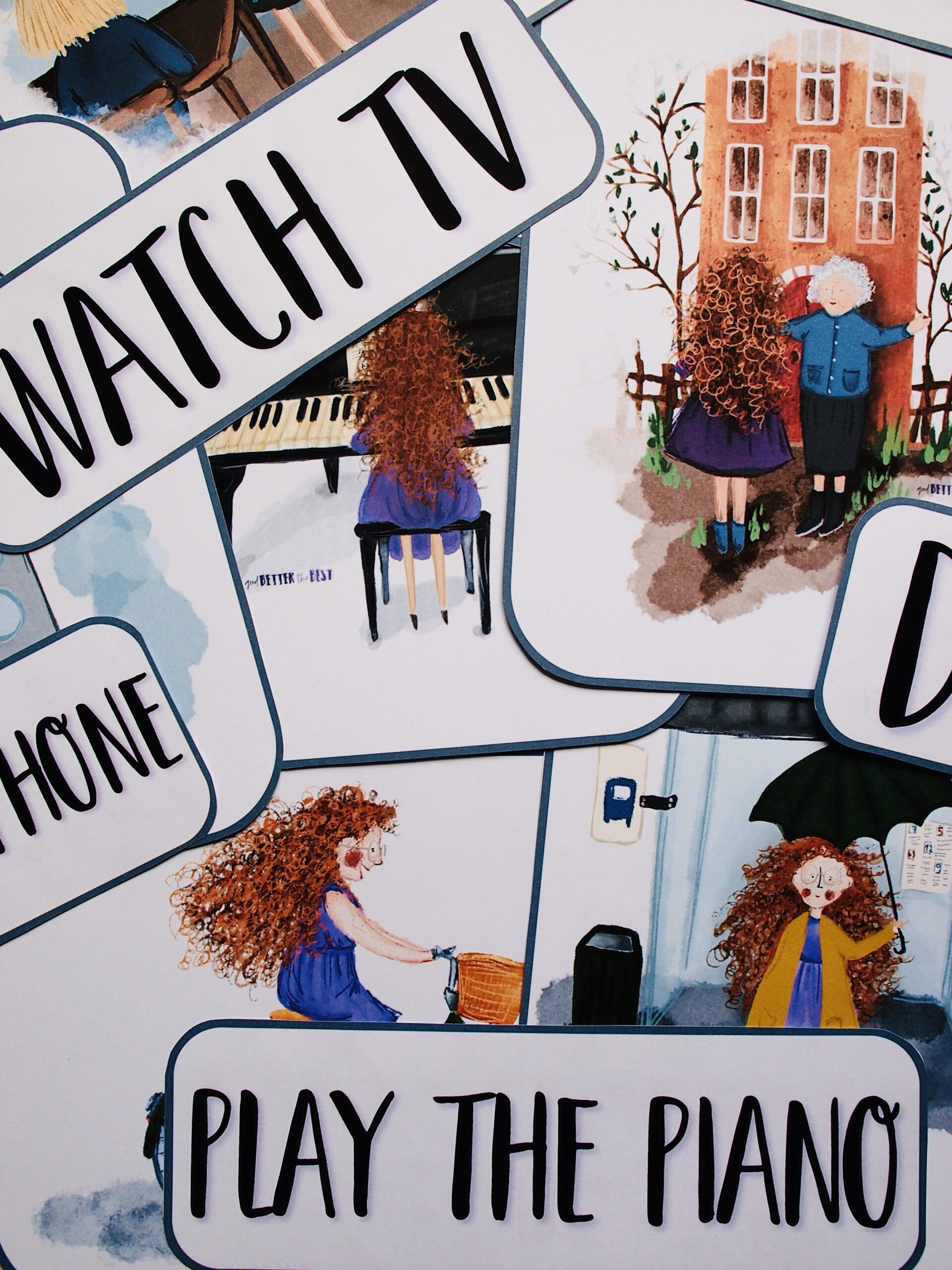 Everyday Activities Flashcards – to zestaw 30 ręcznie malowanych autorskich kart obrazkowych przedstawiających czynności codzienne. Zestaw przeznaczony do pracy z uczniami szkoły podstawowej oraz innymi na poziomie A1/A1+. Po zakupie wysyłany jest plik pdf do samodzielnego wydruku.