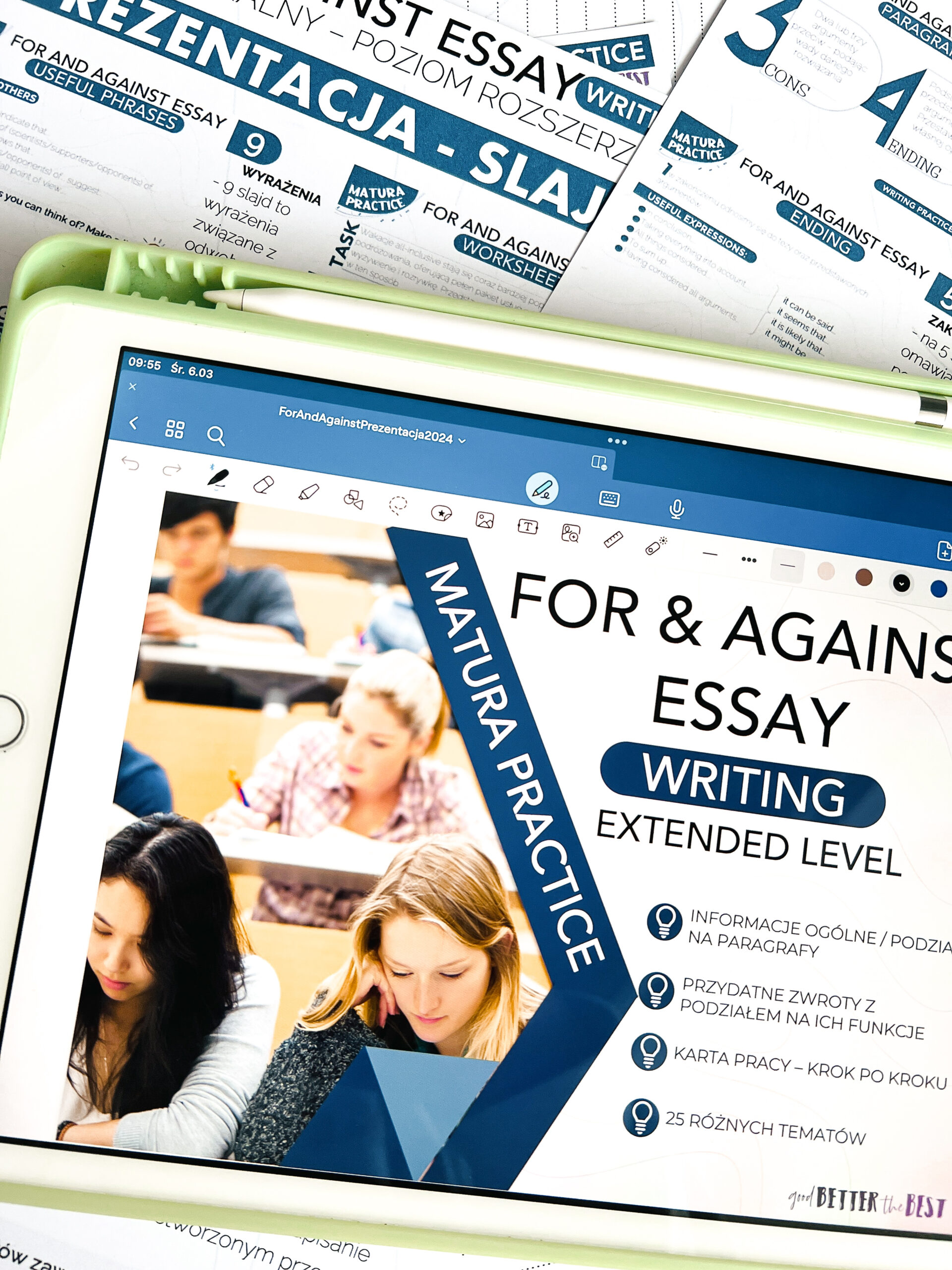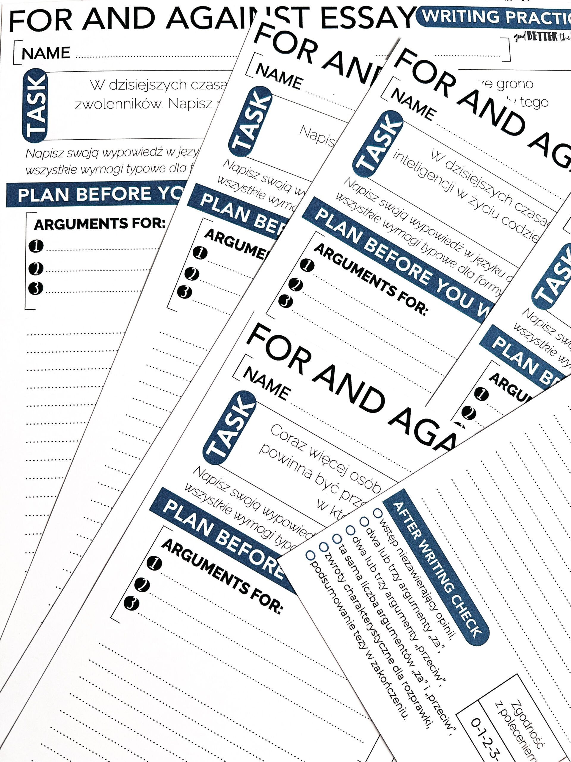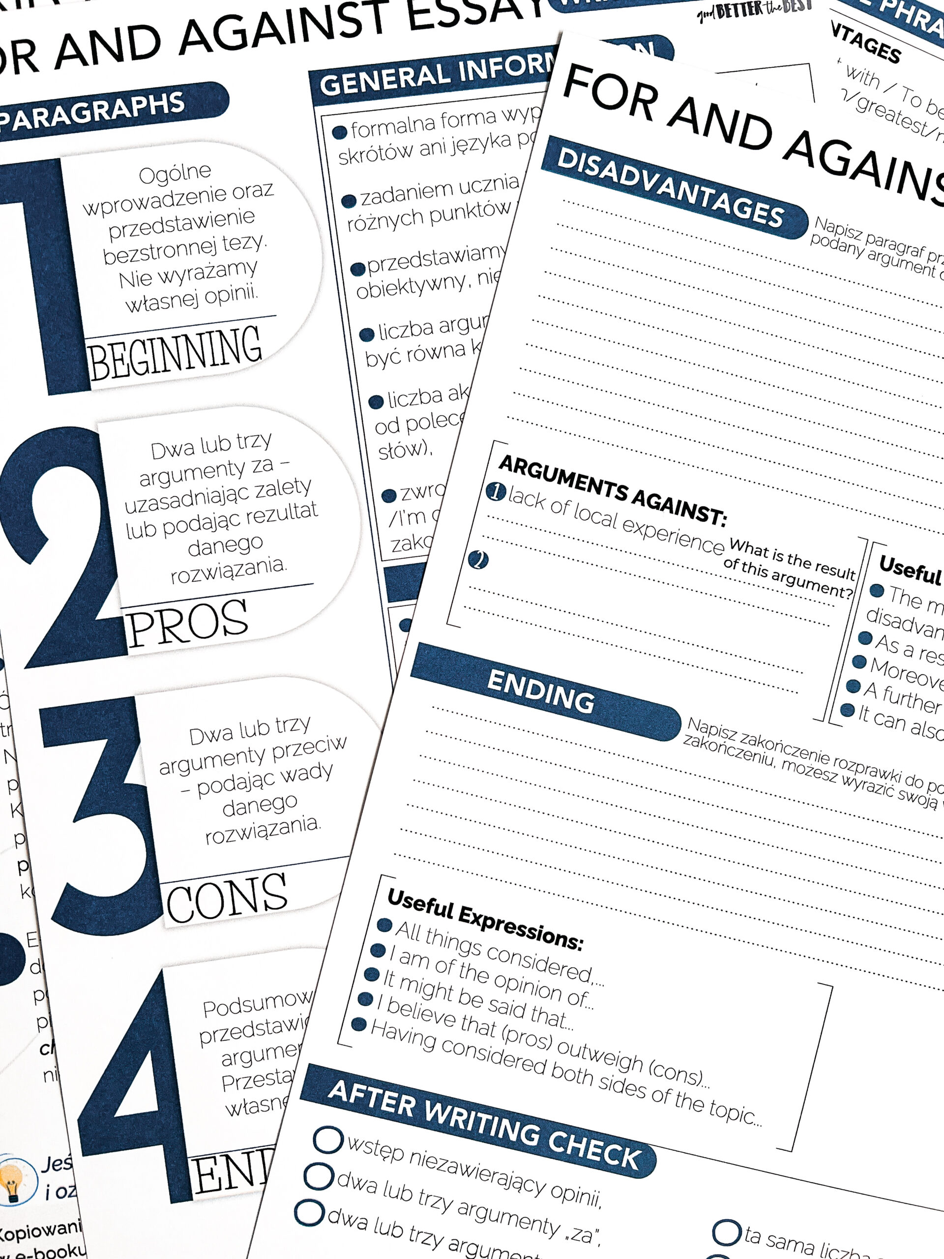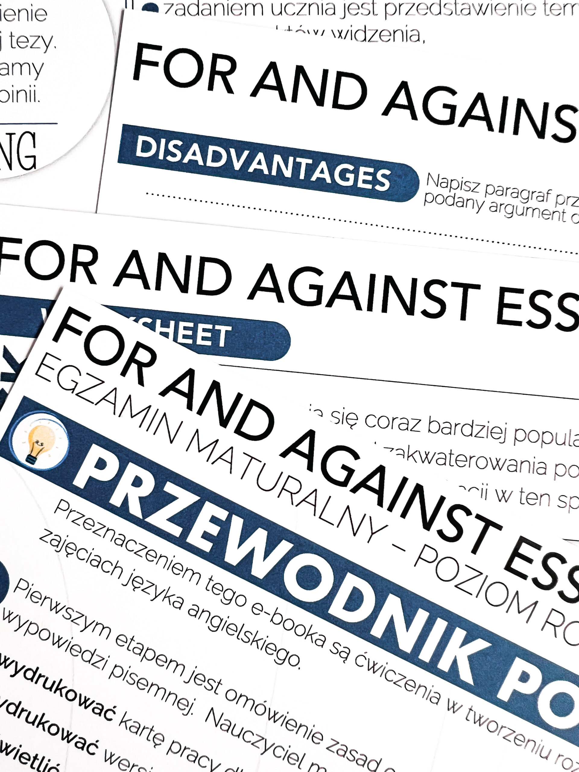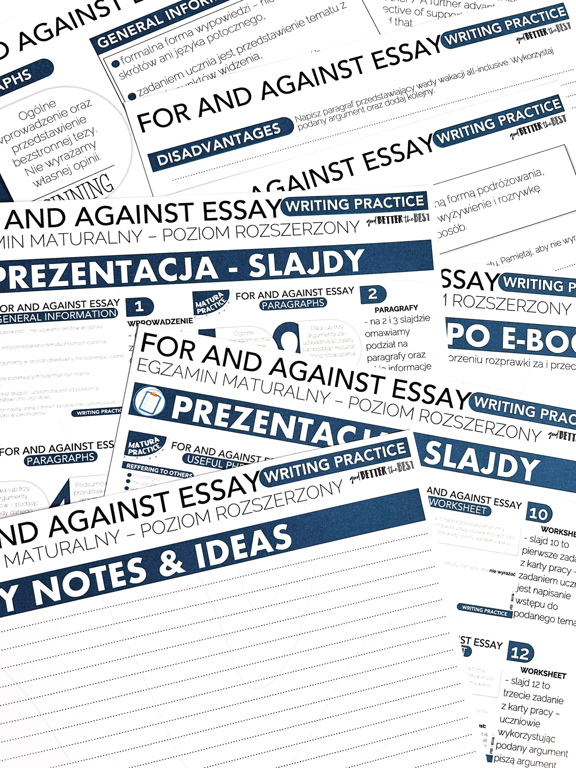 FOR & AGAINST ESSAY – zestaw przeznaczony do pracy z uczniami klas starszych szkoły ponadpodstawowej oraz innymi na poziomie B1/B2/C1. W zestawie e-book z ćwiczeniami dla ucznia, 25 poleceń do napisania rozprawki, prezentacja PDF, e-book dla nauczyciela. Po zakupie wysyłany jest plik PDF do samodzielnego wydruku.