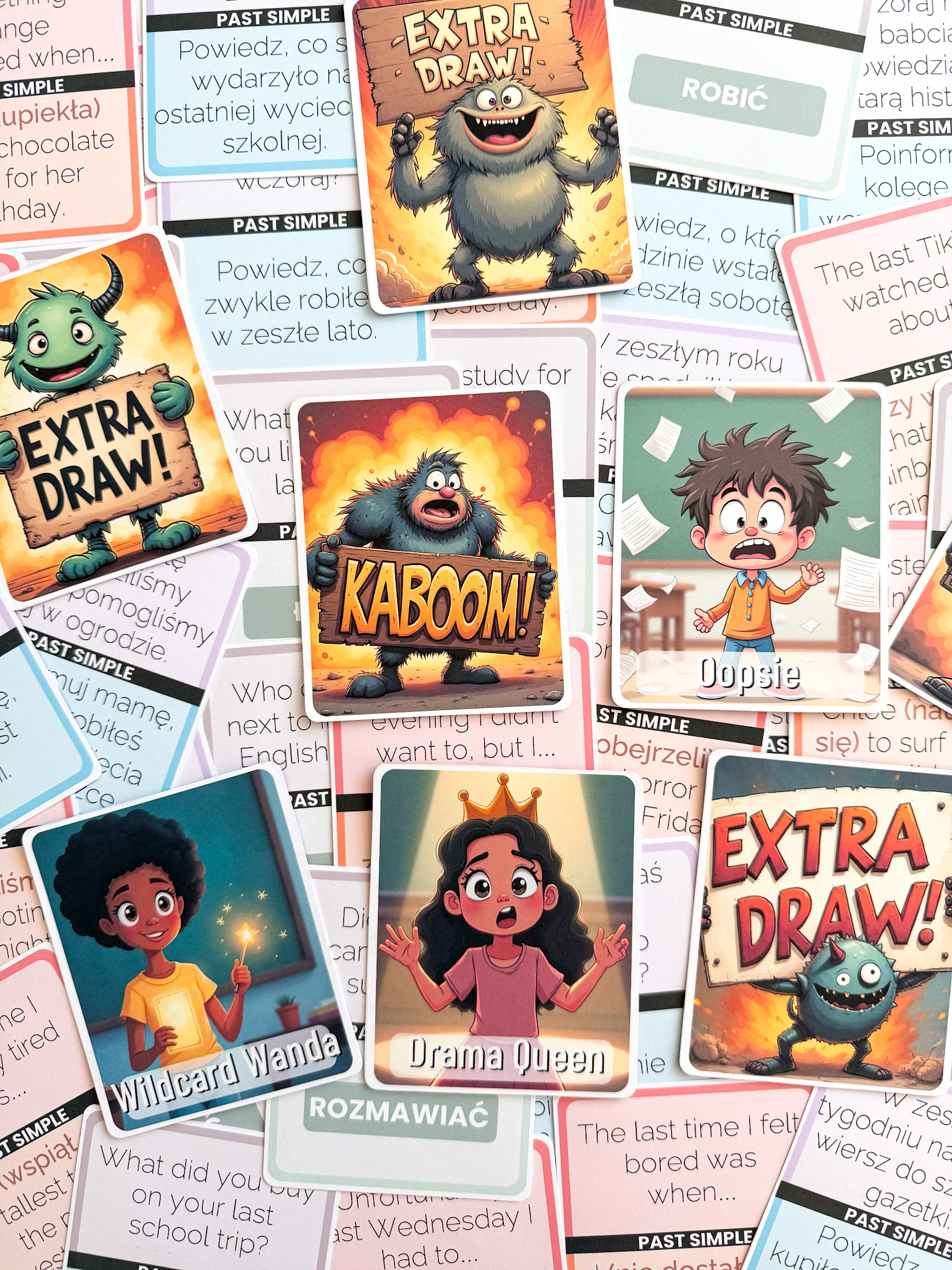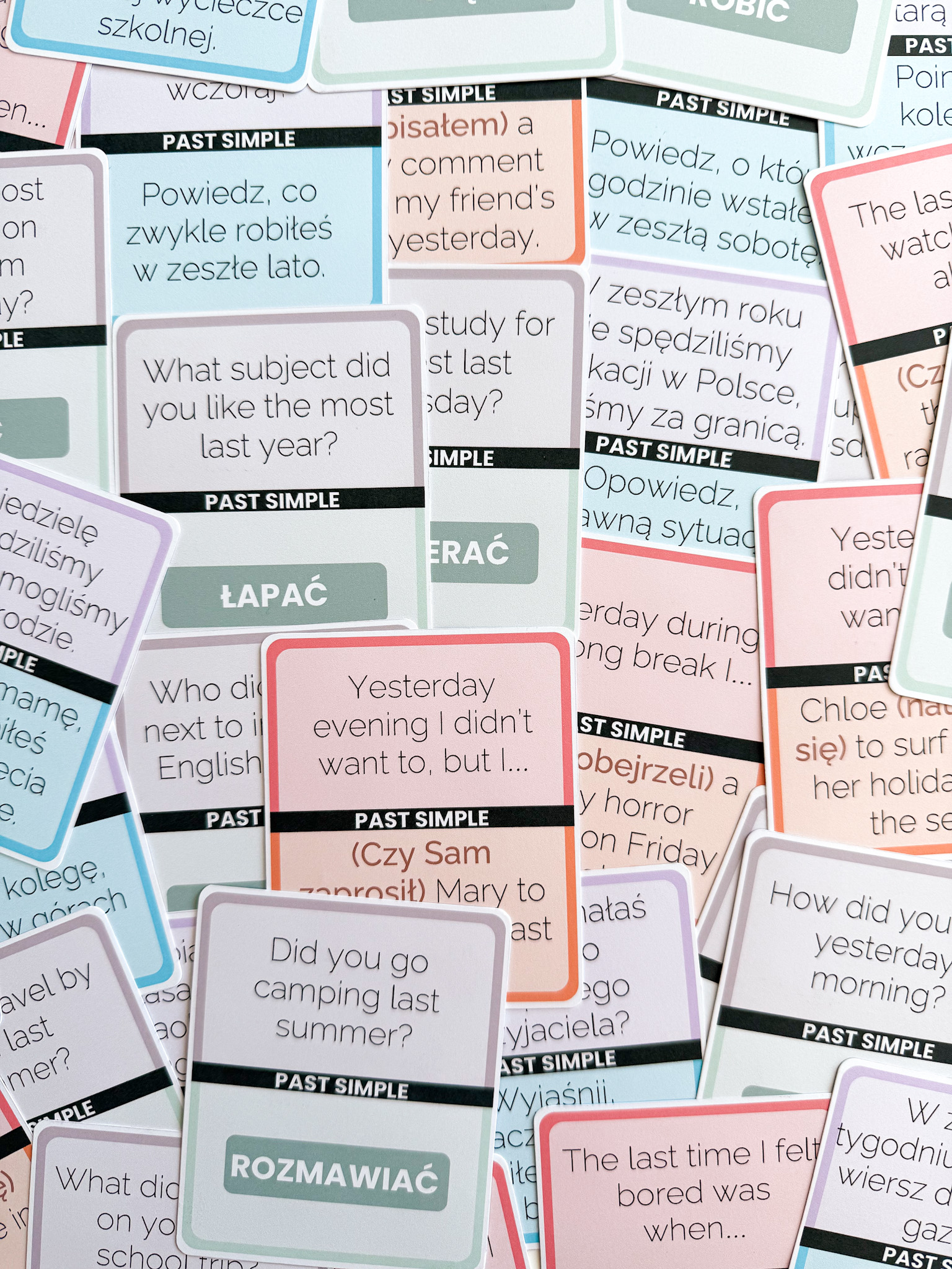 • 3 różne zestawy kart gramatycznych (łącznie 360 zadań) – każda talia to 60 przykładów ćwiczących Past Simple w innej formie.
