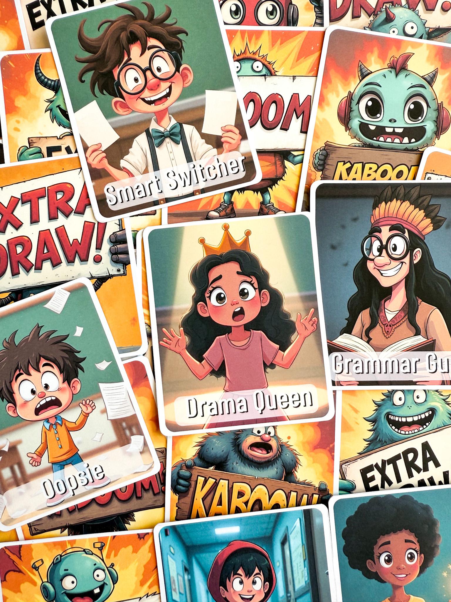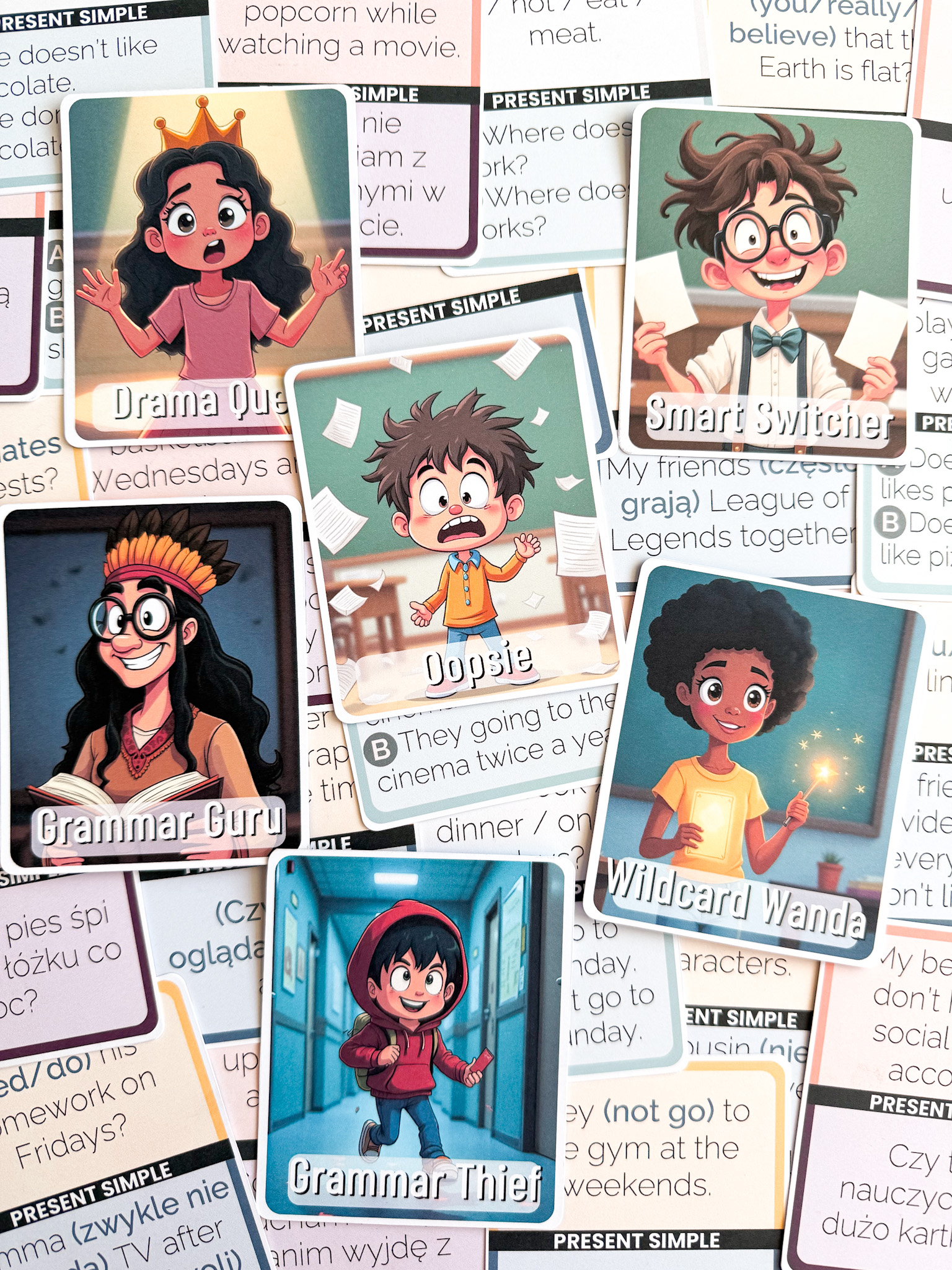 •Pola Funkcyjne z 6 unikalnymi postaciami – te specjalne karty funkcyjne nie tylko dodają element losowości i napięcia, ale również budują klimat gry, wprowadzając zaskoczenie, śmiech i… nutkę rywalizacji! Wśród postaci znajdziesz m.in.: Grammar Guru, Wildcard Wanda, Drama Queen i inne!