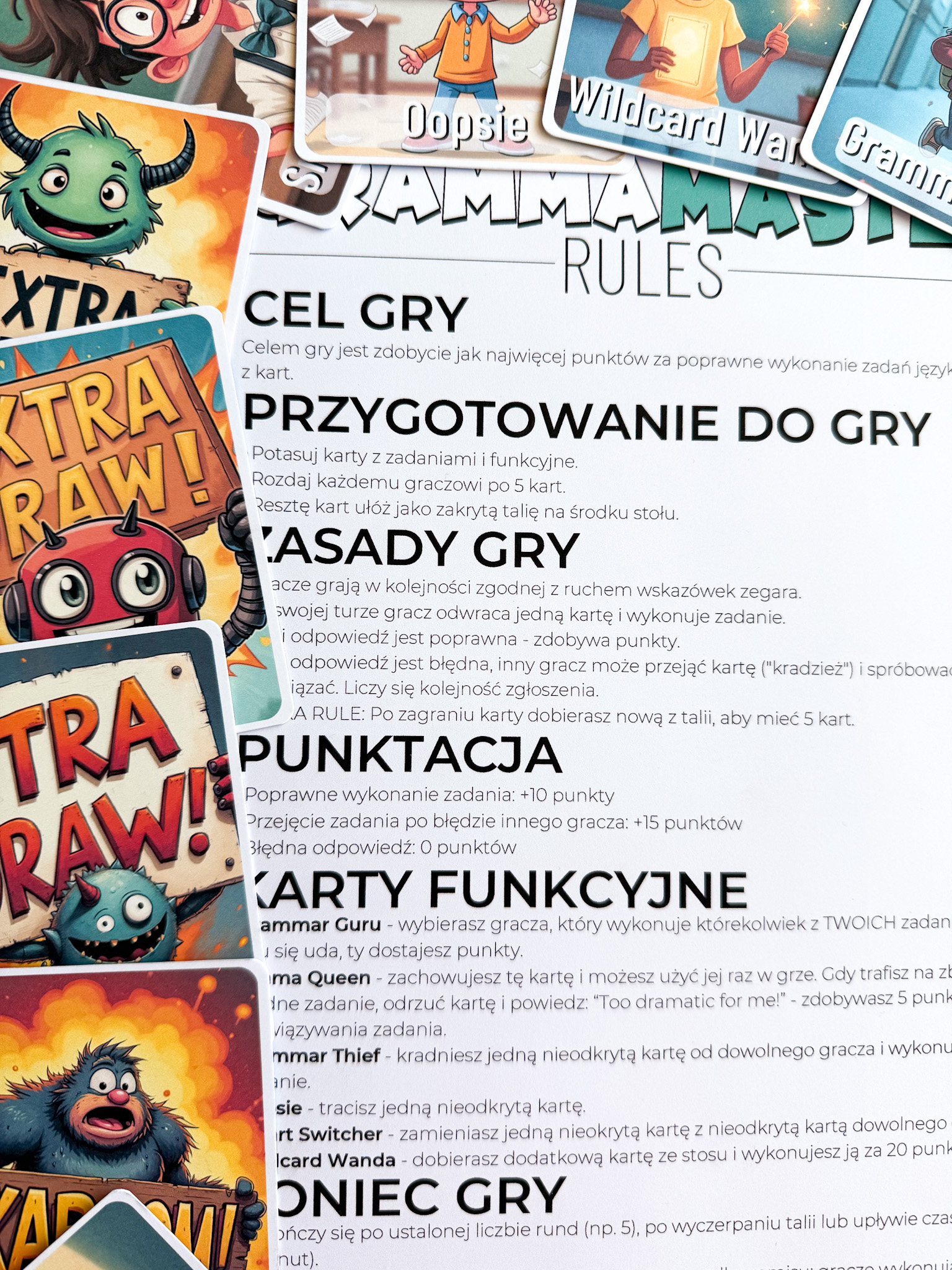 🖨 5 plików PDF: Teacher GrammaMaster (6 stron), Cards GrammaMaster (31 stron), Function Cards: GrammaMaster (5 stron), Rule Card: GrammaMAster (1 strona), Background: GrammaMaster (6 stron).