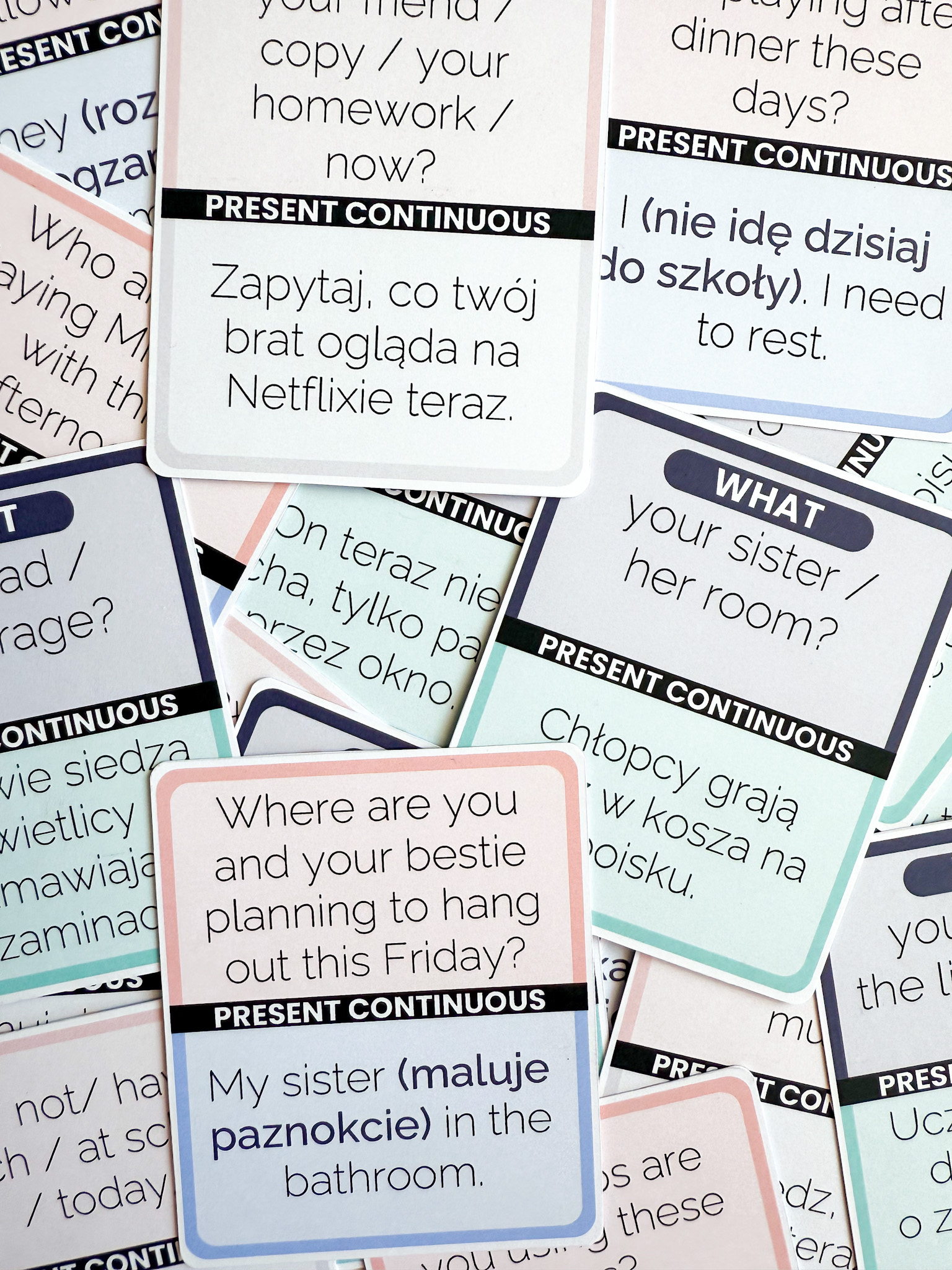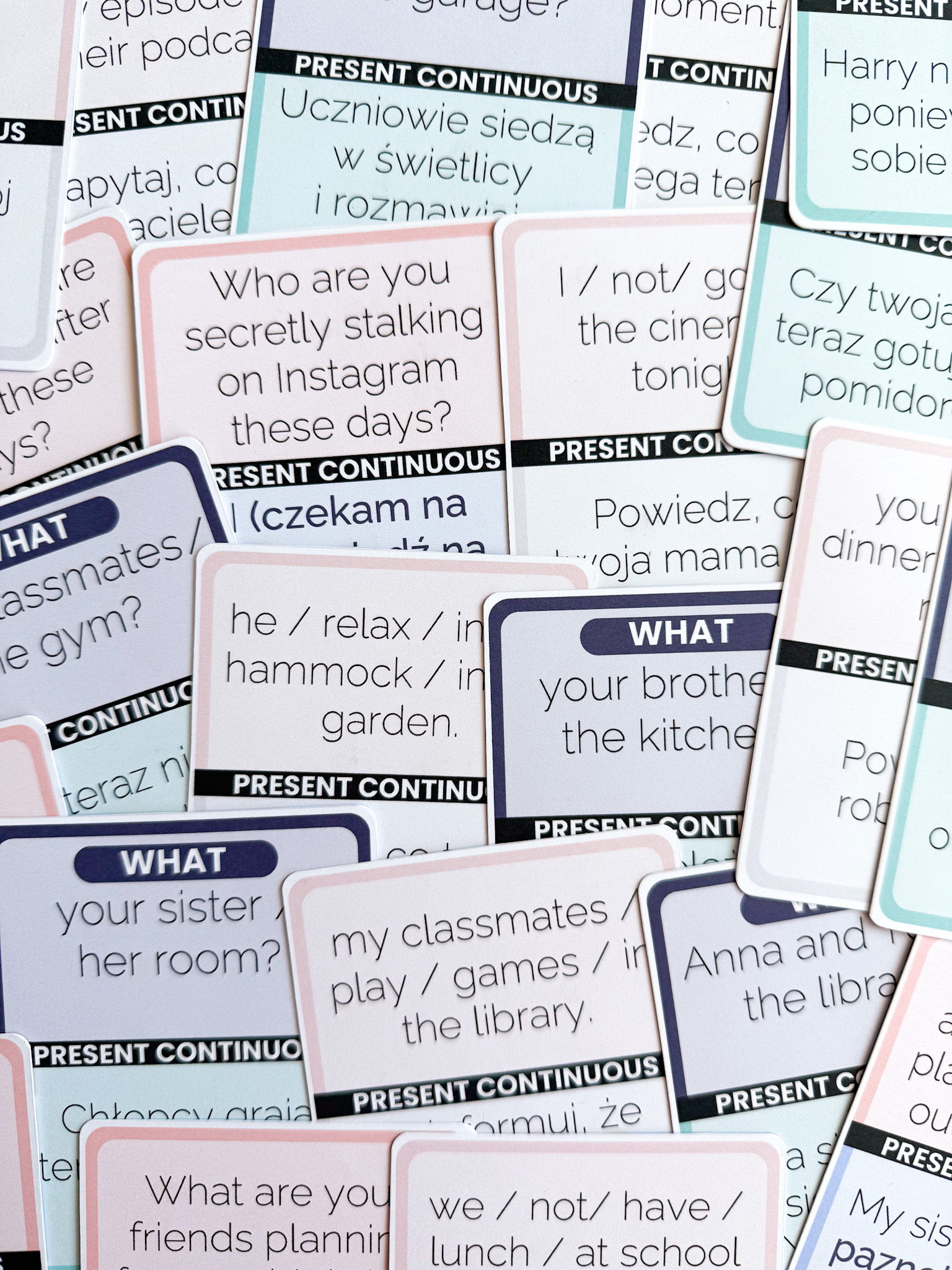 • 3 różne zestawy kart gramatycznych (łącznie 360 zadań) – każda talia to 60 przykładów ćwiczących Present Continuous w innej formie.