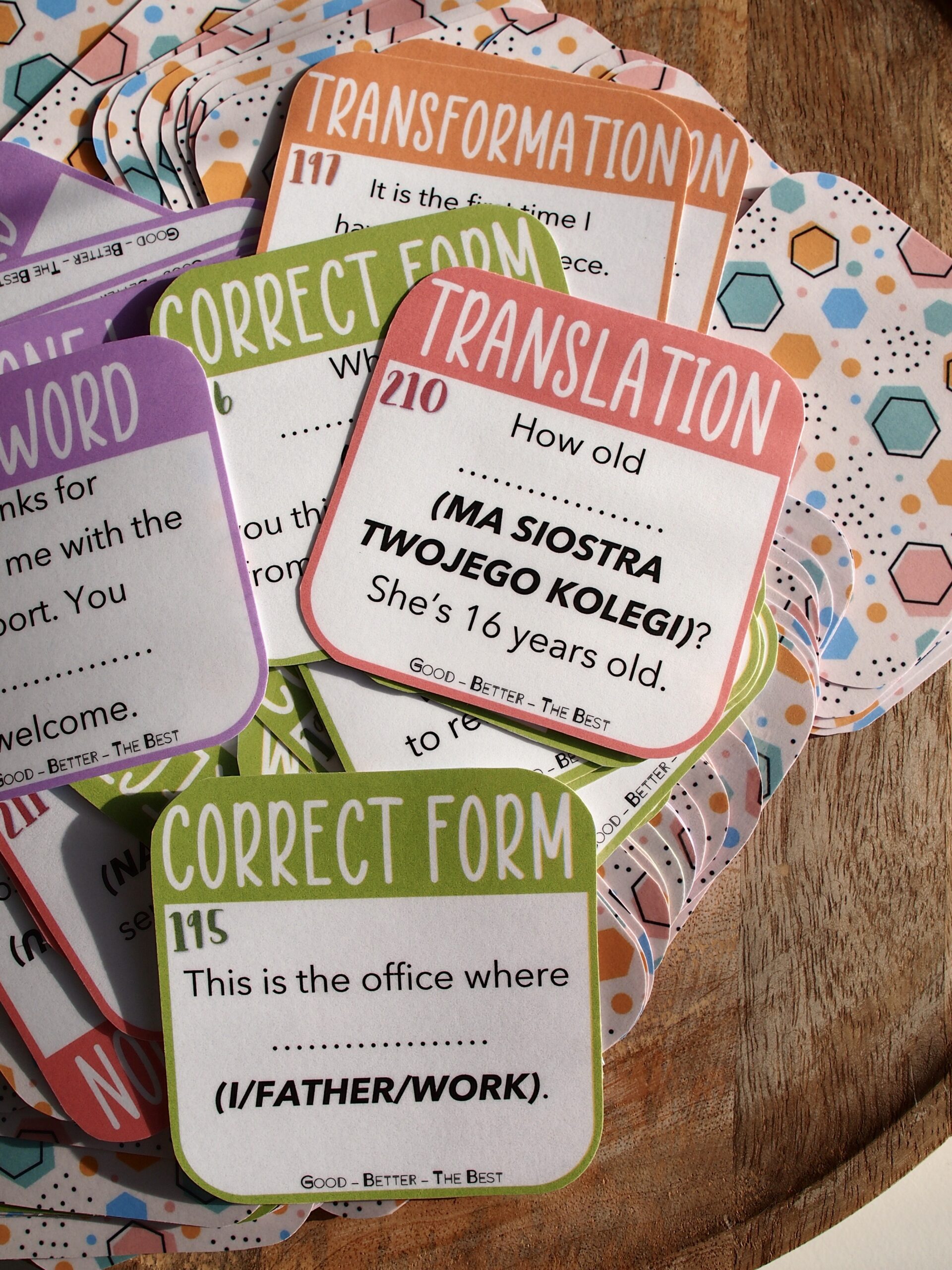 🔸 133 kolorowe kart gramatyczne, ze zdaniami z kart pracy (można wykorzystać do powtórek po przerobionych kartach ucznia)