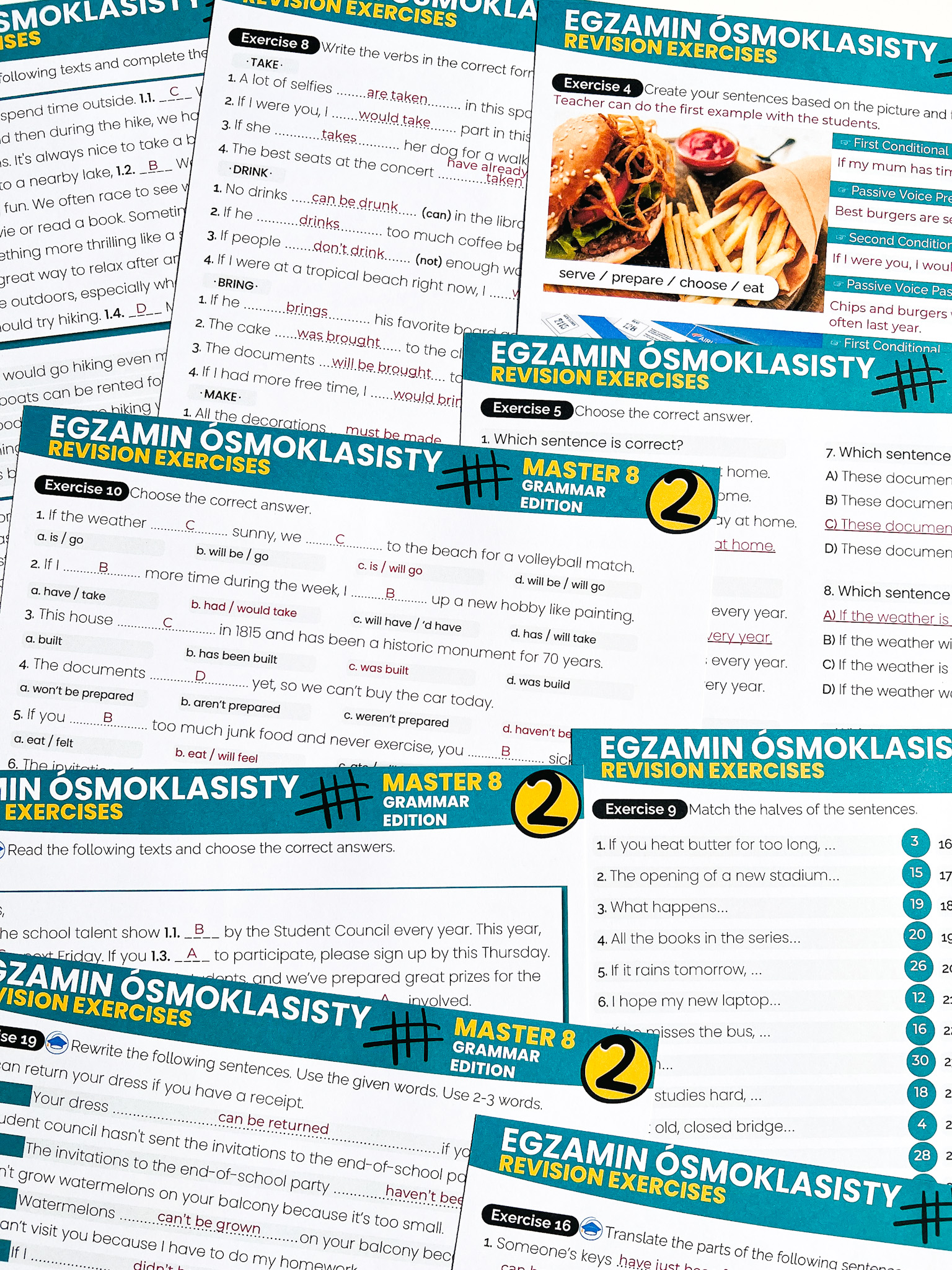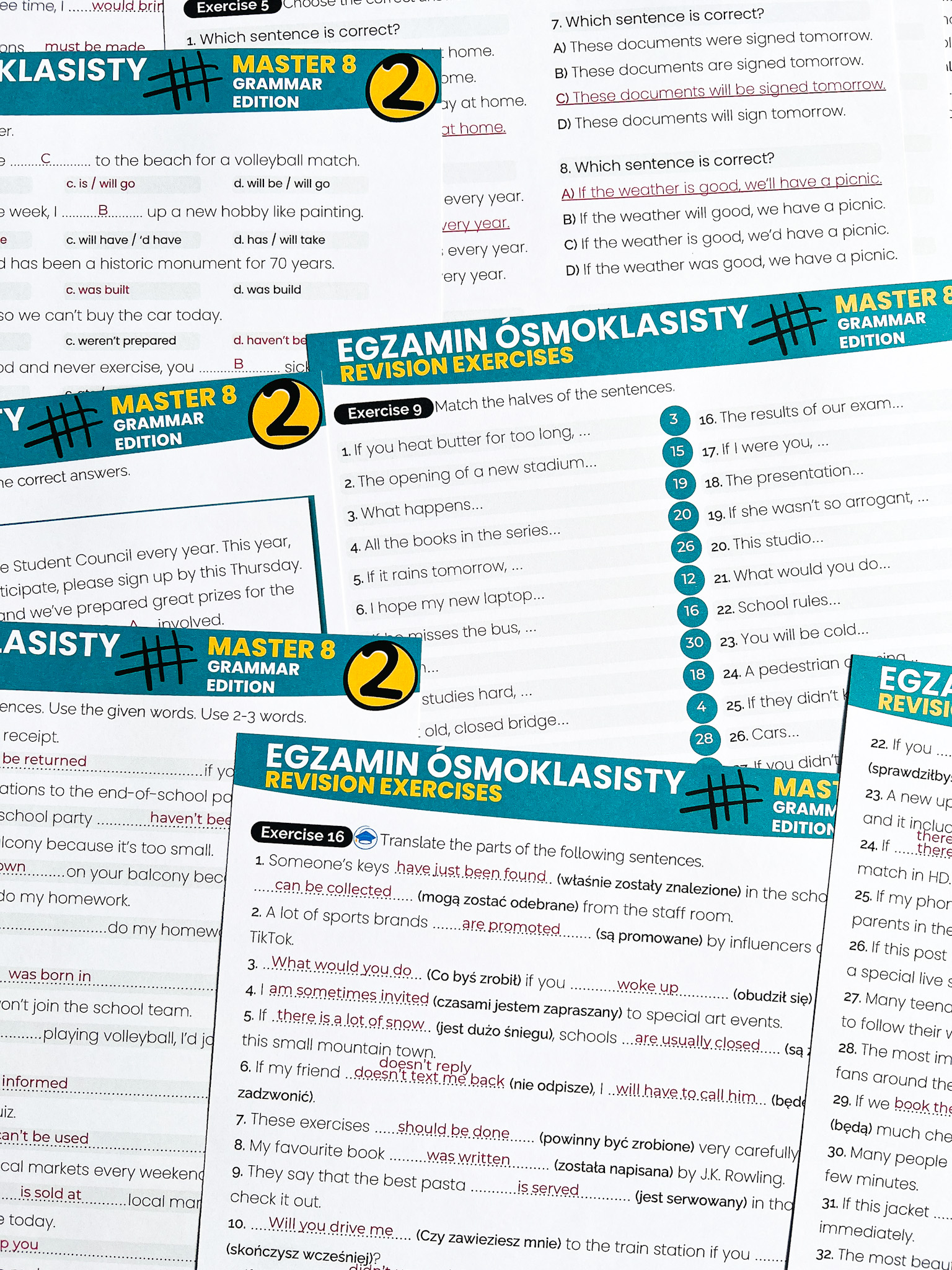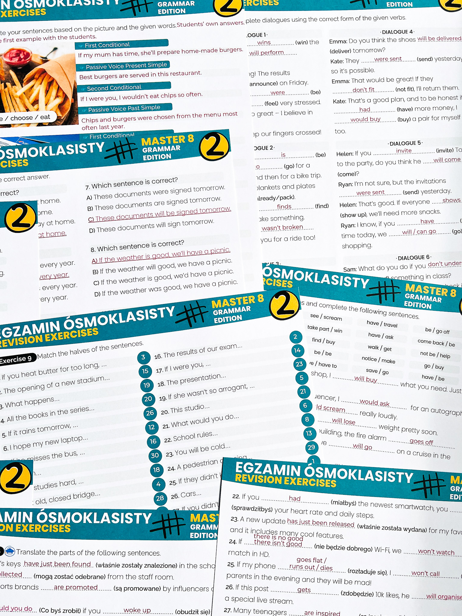 Master 8: Passive & Conditionals – skuteczny zestaw ćwiczeń, który pozwoli Twoim uczniom powtórzyć i utrwalić stronę bierną oraz tryby warunkowe w praktycznych zadaniach, również tych egzaminacyjnych! Dzięki różnorodnym formom ćwiczeń uczniowie lepiej zrozumieją te kluczowe konstrukcje i przećwiczą ich zastosowanie w kontekście egzaminu ósmoklasisty.