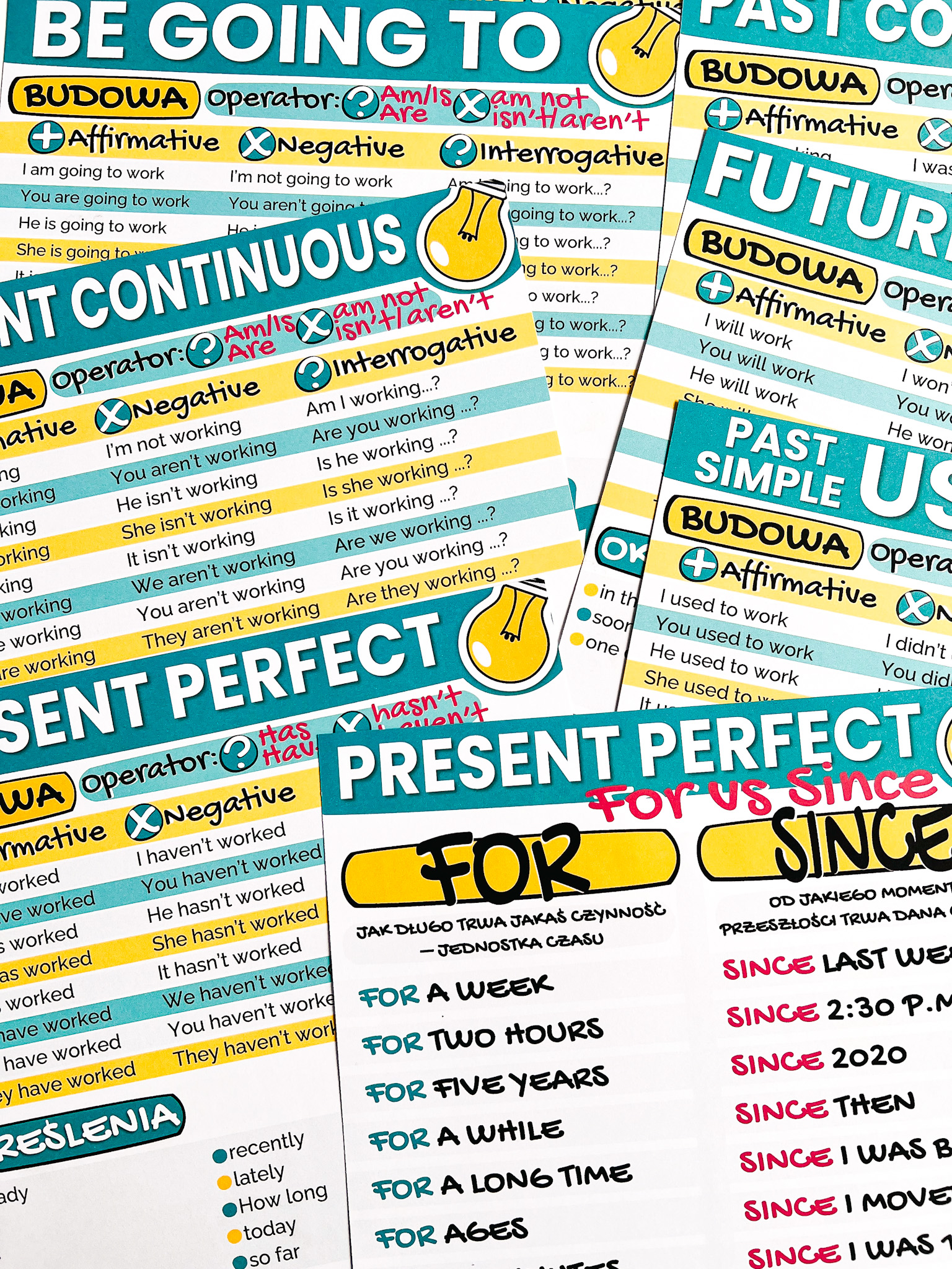 Zakres plakatów: • Present Simple • Present Continuous • Present Perfect • Past Simple • Past Continuous • Future Simple • Used to • Be Going to • For & Since