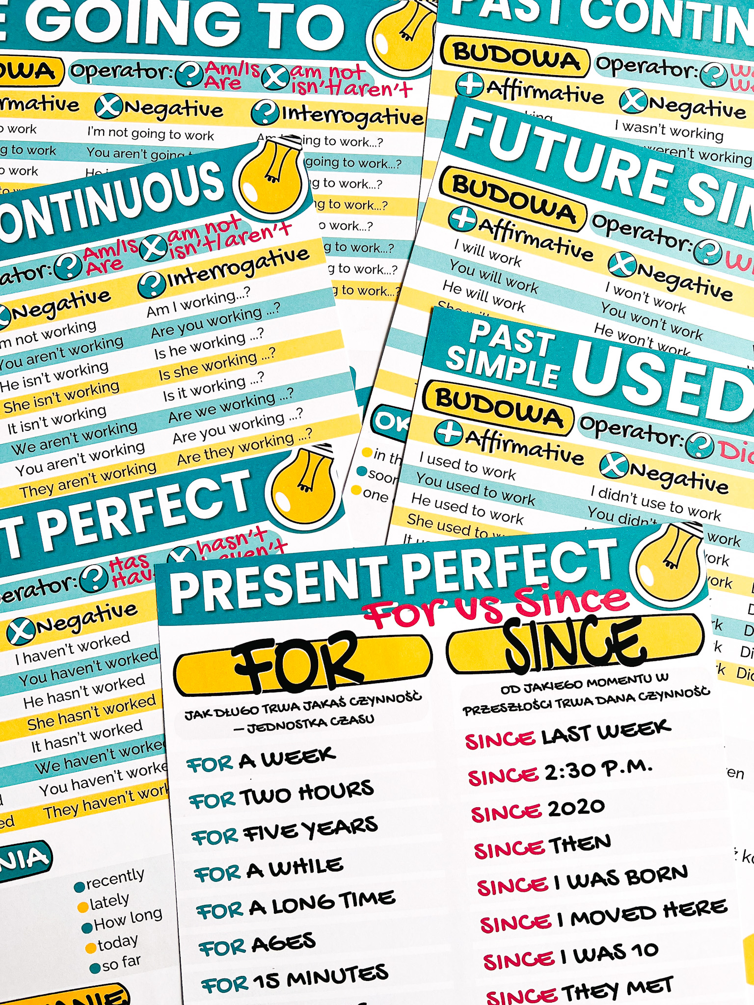 • Zestaw 9 plakatów – Mixed Tenses – przejrzyste schematy z budową, zastosowaniem i przykładami dla wszystkich czasów i konstrukcji z e-booka Mixed Tenses.