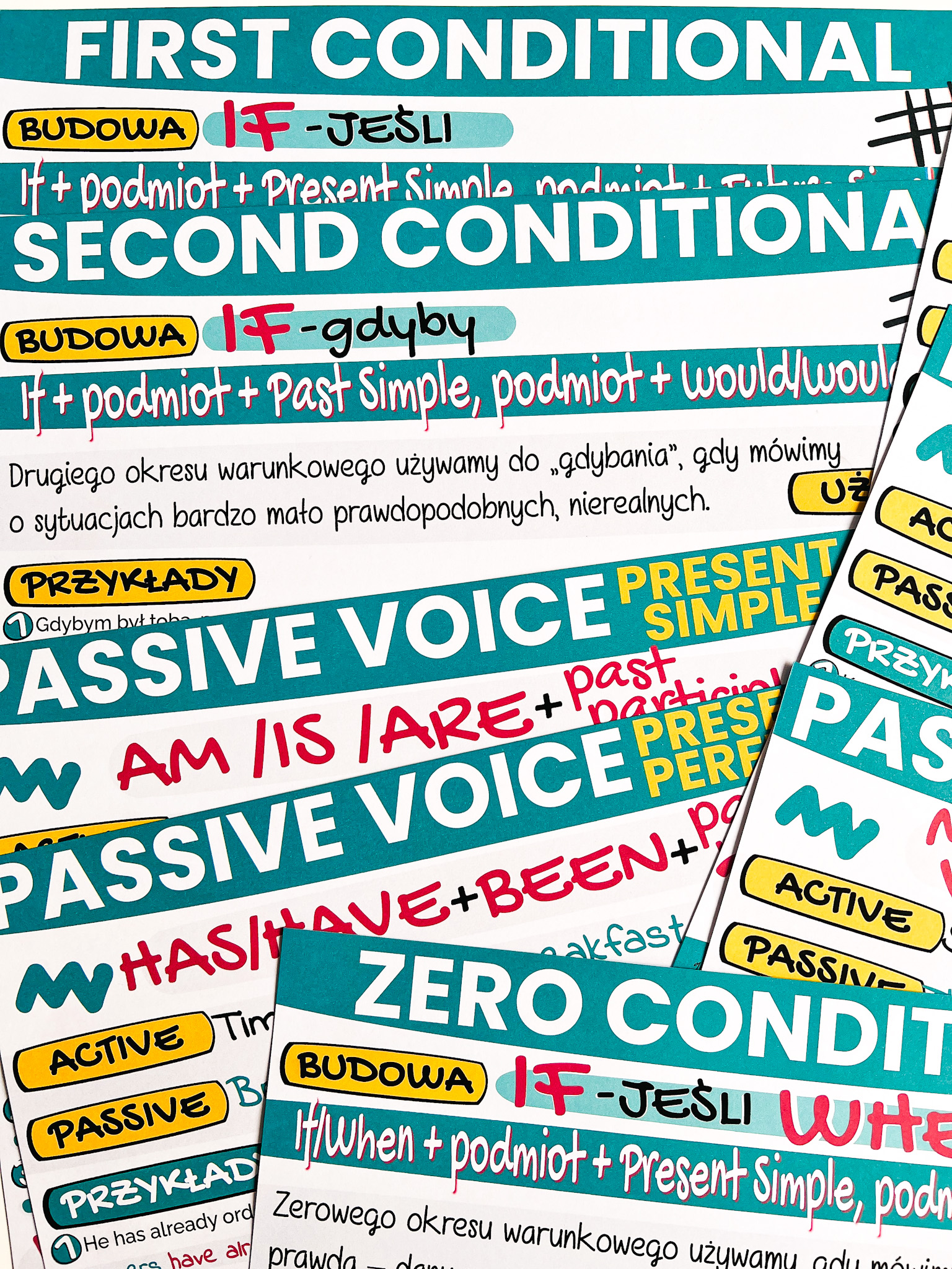 • Zestaw 8 plakatów – Passive & Conditionals – schematy wizualizujące tryby warunkowe oraz stronę bierną, ułatwiające uczniom zapamiętywanie i poprawne stosowanie tych struktur.