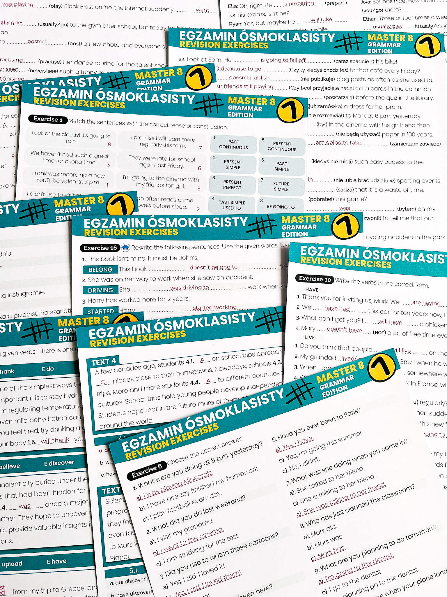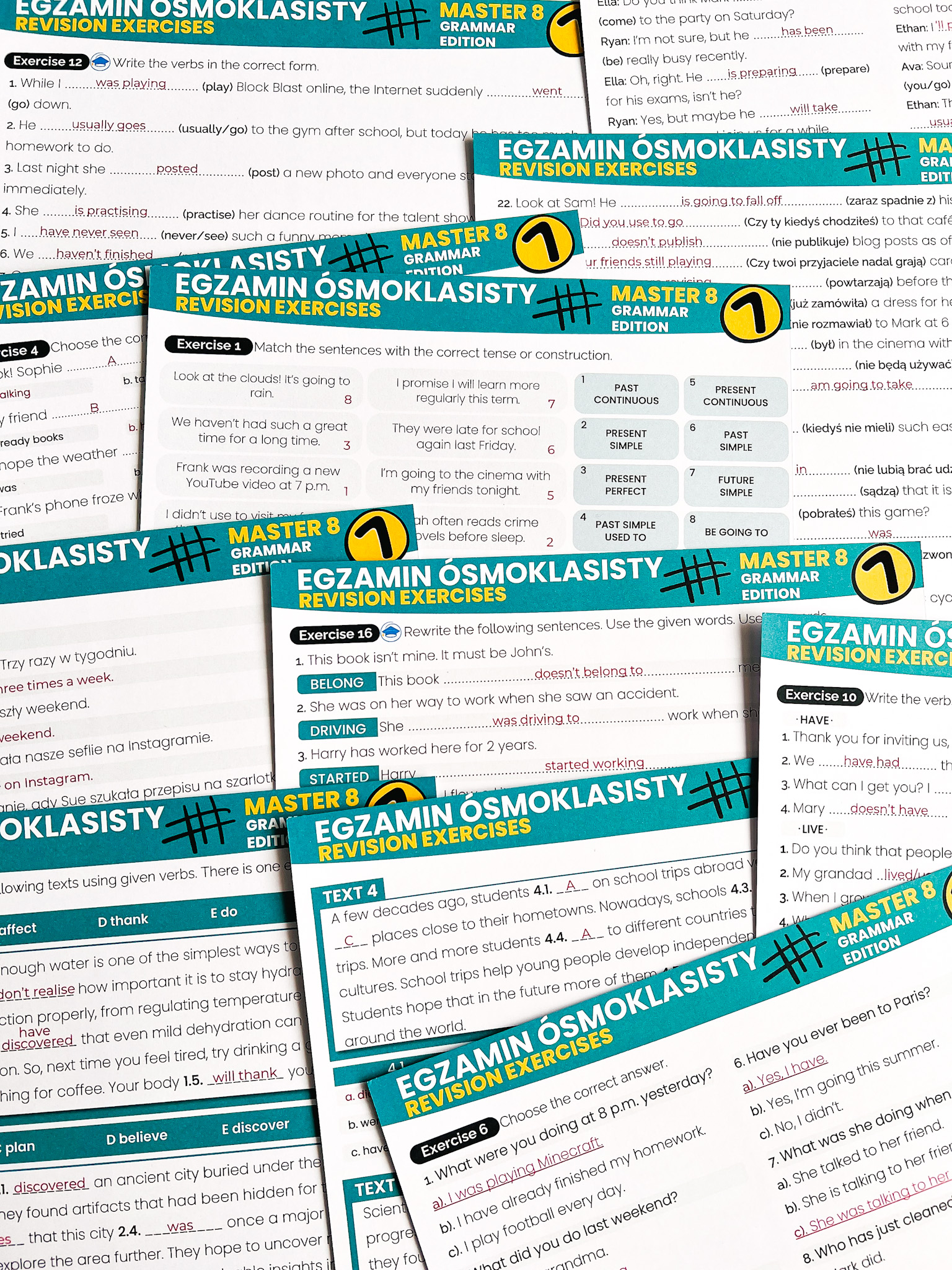 • Master 8: Mixed Tenses – e-book (30 stron) zawierający 19 różnorodnych zadań i prawie 450 przykładów, które pomagają utrwalić Present Simple, Present Continuous, Present Perfect, Past Simple, Past Continuous, Future Simple, Used to oraz Be Going to.