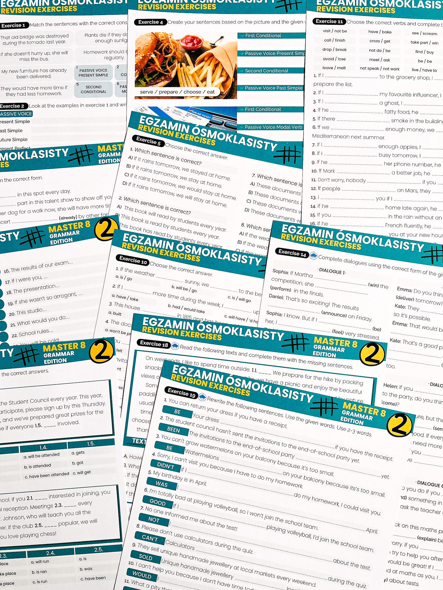 • Master 8: Passive & Conditionals – e-book (30 stron) z 22 zadaniami i blisko 460 przykładami, który pozwala na powtórkę trybów warunkowych (0, 1, 2,) oraz strony biernej (Present Simple, Past Simple, Present Perfect, Future Simple, Modal Verbs).