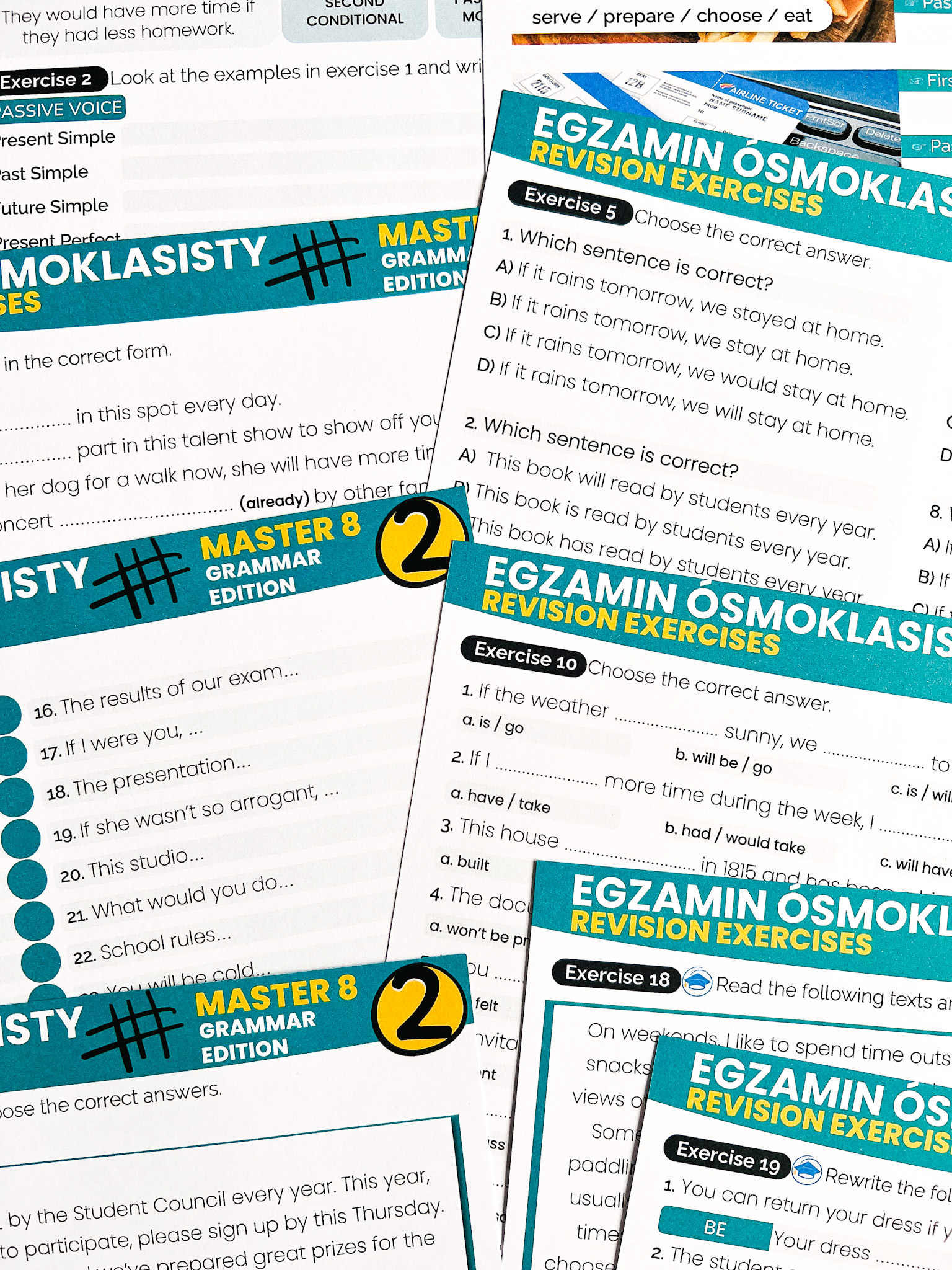 🖨 6 plików PDF: Master 8: Mixed Tenses Student (30 stron), Master 8: Mixed Tenses Teacher (30 stron), Master 8: Passive & Conditionals Student (30 stron), Master 8: Passive & Conditionals Teacher (30 stron), Posters: Mixed Tenses (9 stron), Posters: Passive & Conditionals (8 stron),