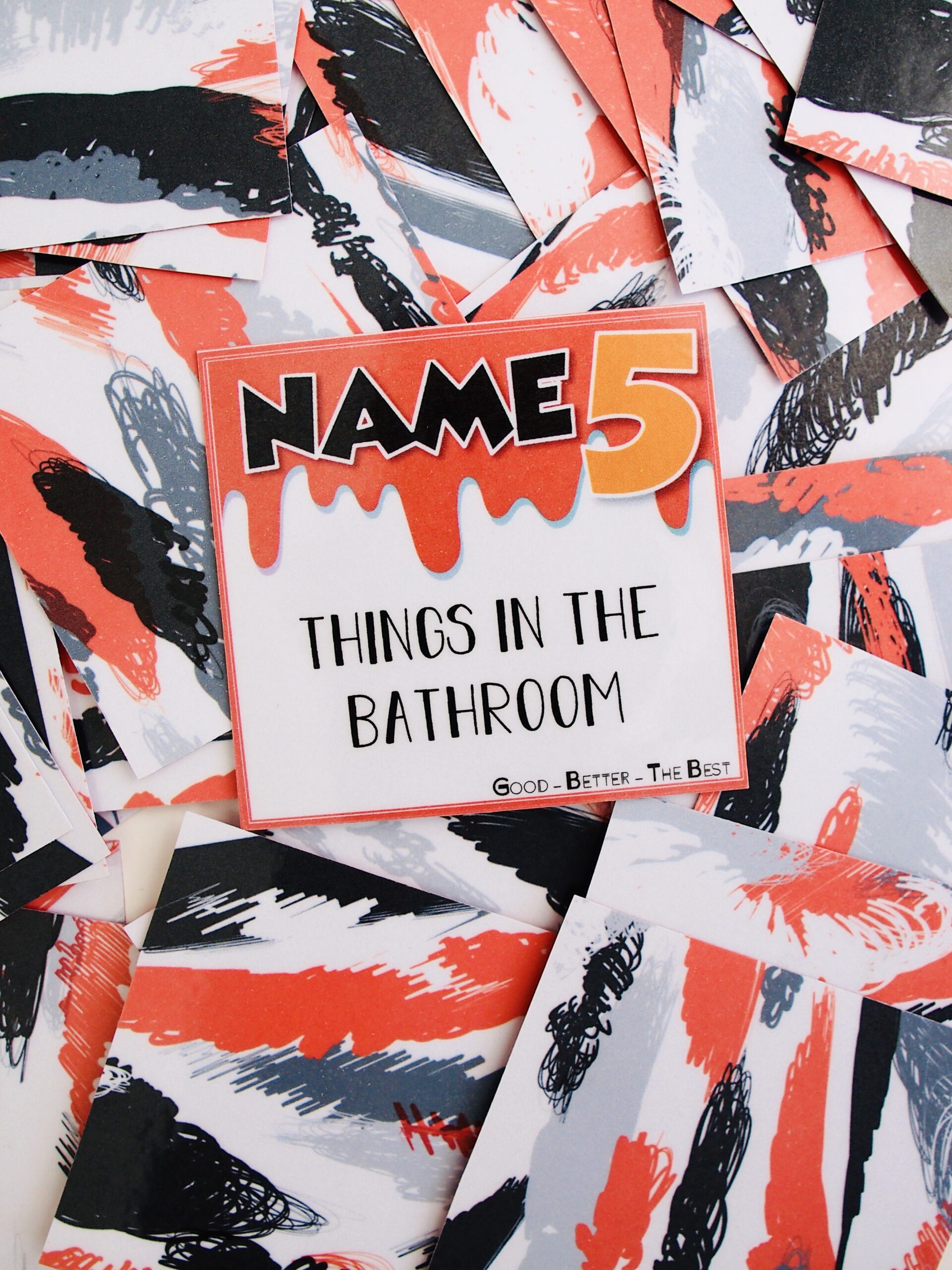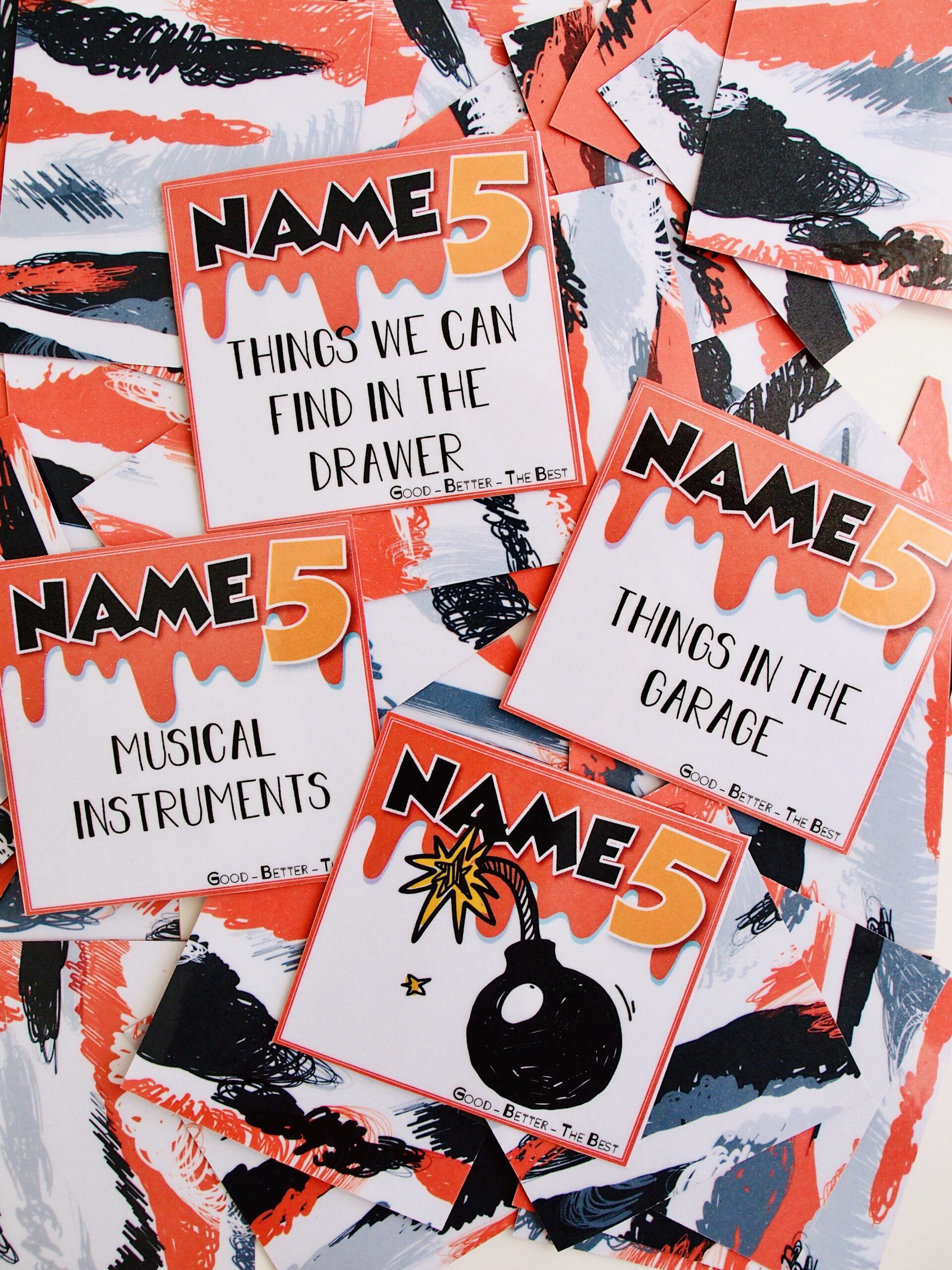 Gra Name Five polega na podaniu 5 słów z podanej kategorii, w grę można grać na drużyny, w parach lub całą grupą. Jeśli masz mocne grupy – możesz ustalić time limit np 1 minutę.