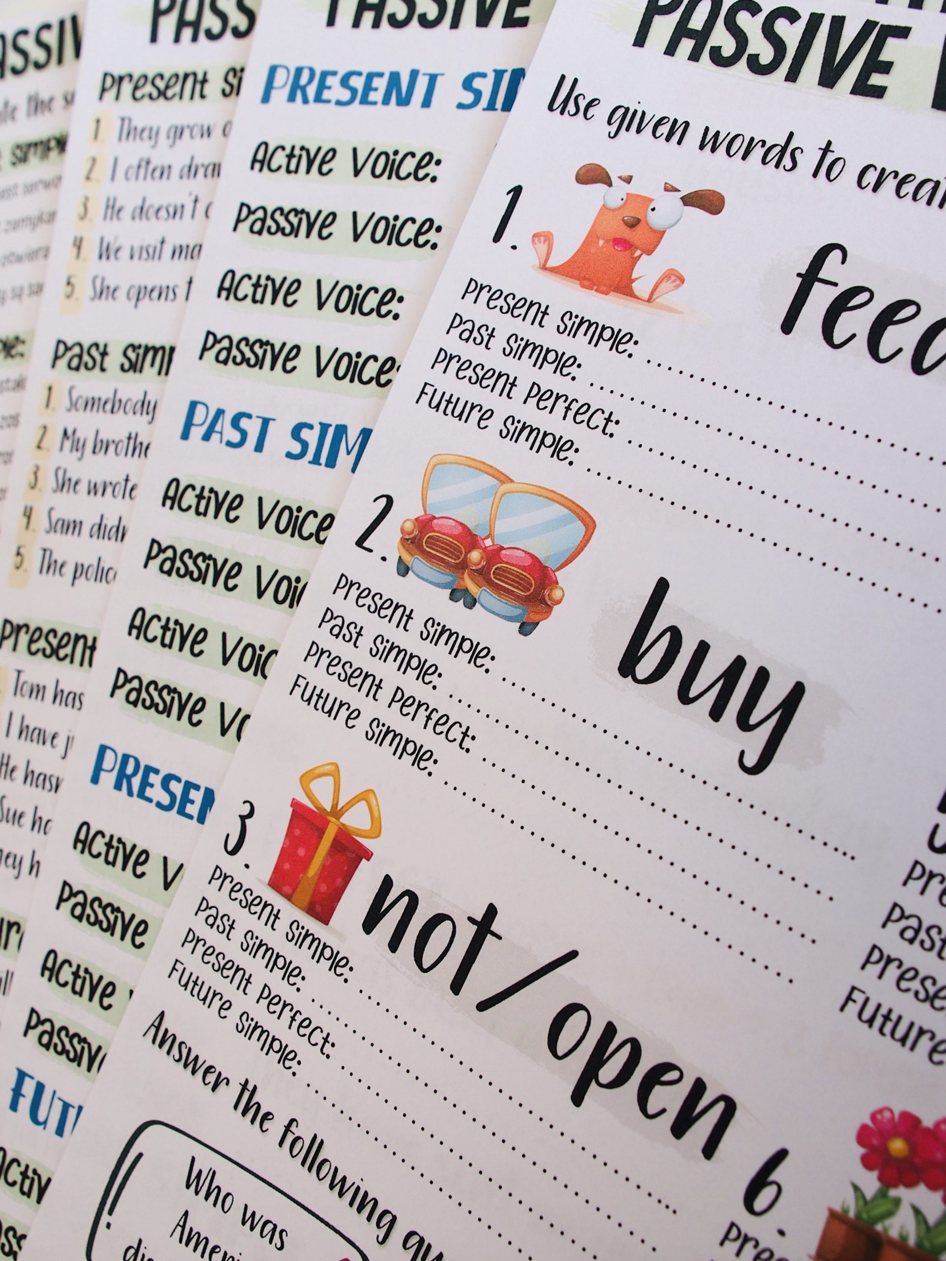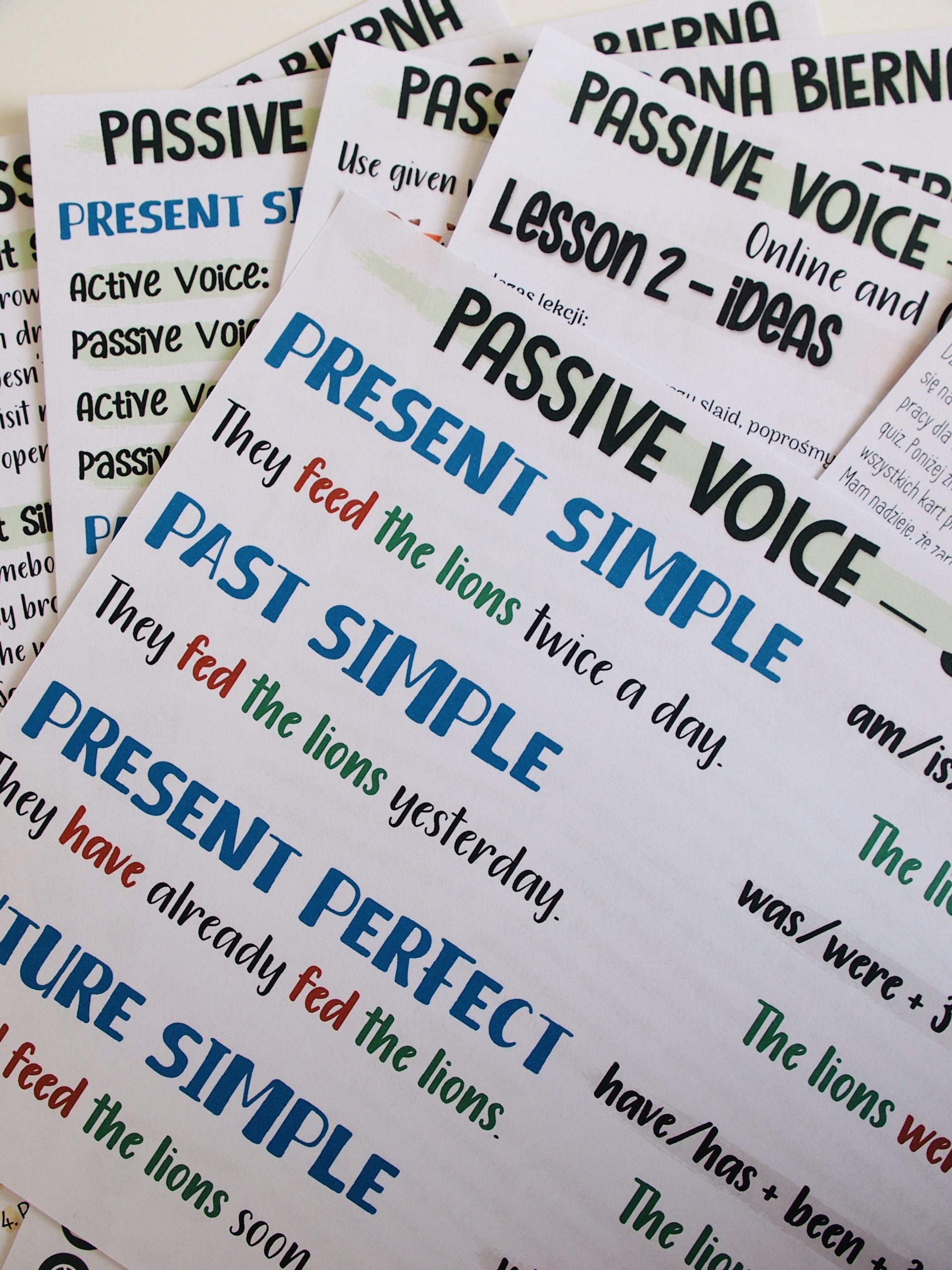 Passive Voice – Online & Offline Lessons – zestaw przeznaczony do pracy z uczniami klas starszych szkoły podstawowej oraz innymi na poziomie A2. Obejmuje czasy wymagane do Egzaminu Ósmoklasisty: Present Simple. Past Simple, Present Perfect oraz Future Simple. Materiały wysyłane są w pliku pdf – do samodzielnego wydruku.