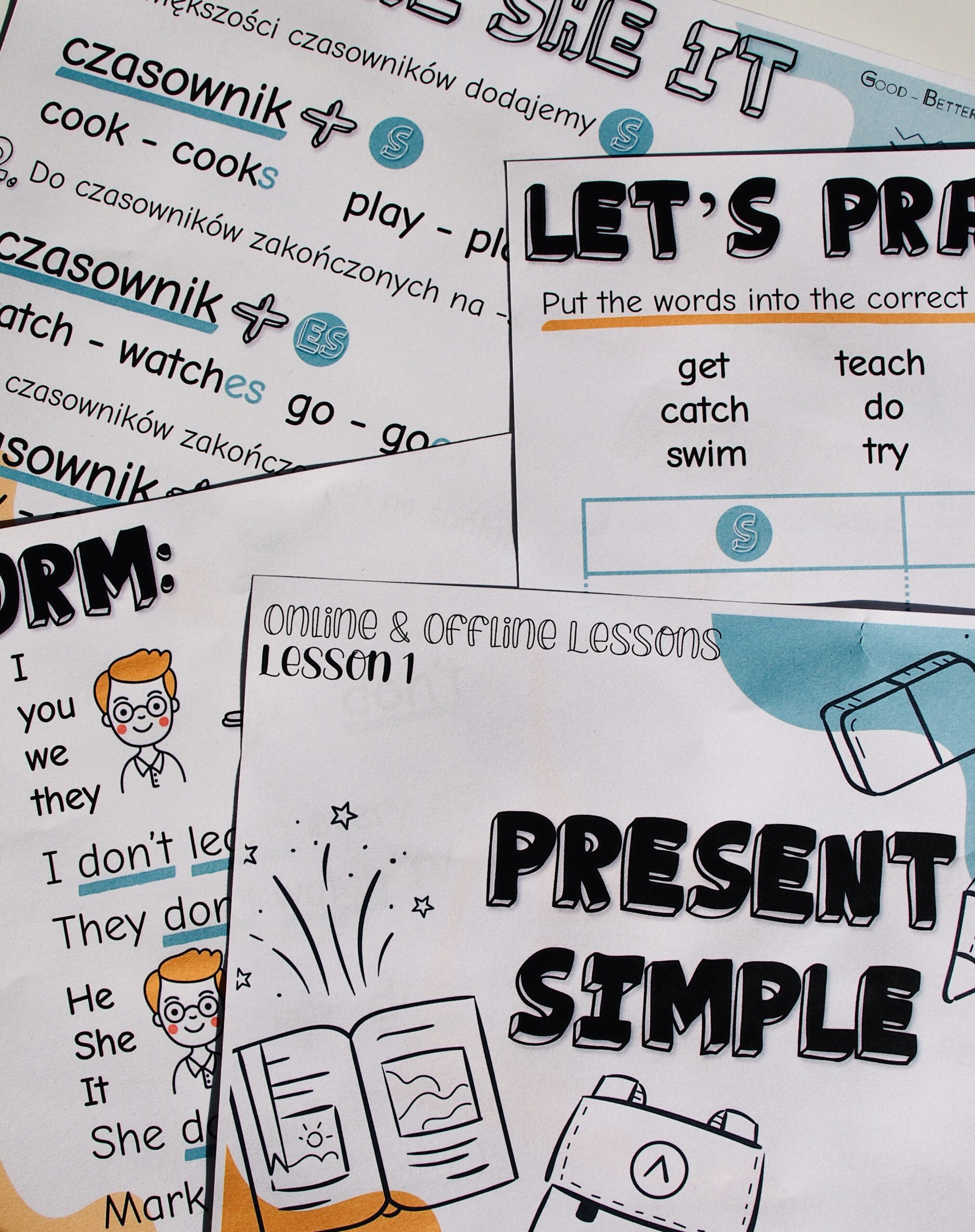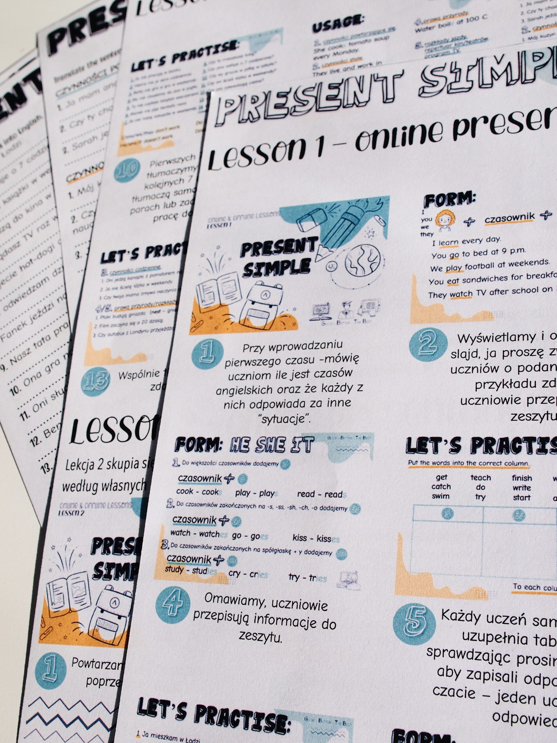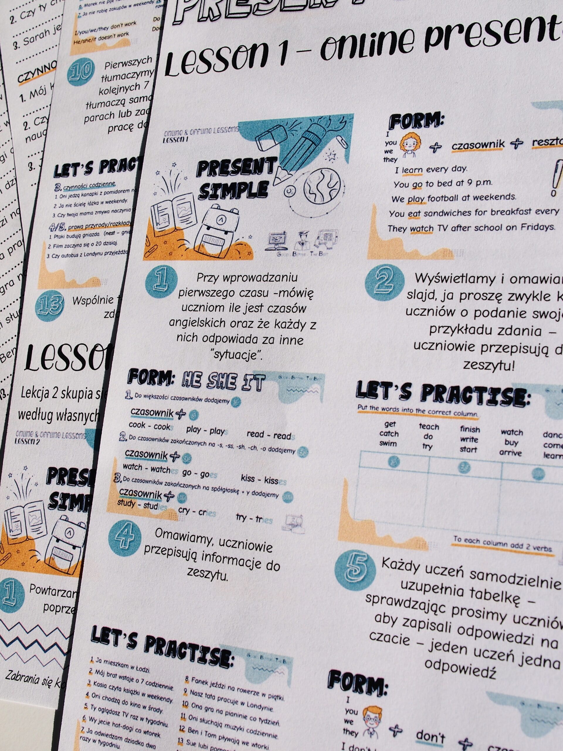 Present Simple – Online & Offline Lessons – zestaw przeznaczony do pracy z uczniami klas szkoły podstawowej oraz innymi na poziomie A1. Obejmuje najważniejsze użycie, określenia czasu oraz tworzenie zdań twierdzących, przeczeń oraz pytań. Materiały wysyłane są w pliku pdf – do samodzielnego wydruku.