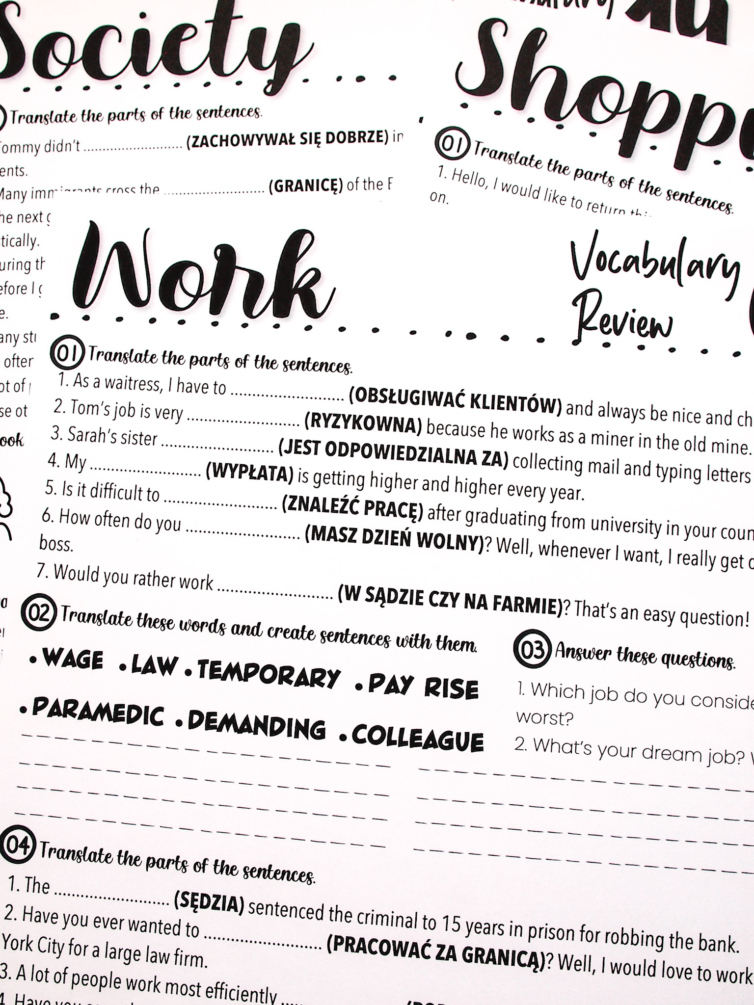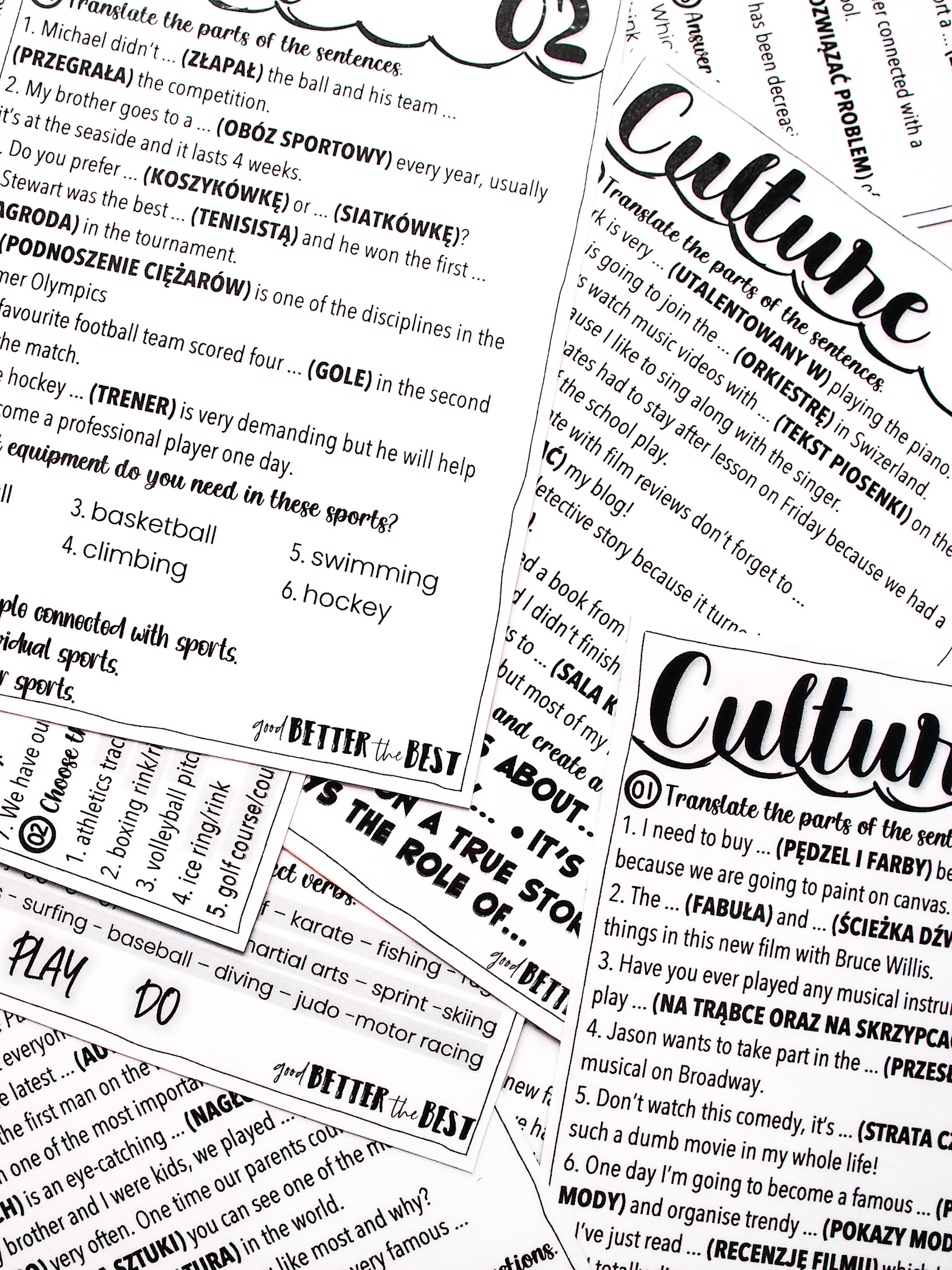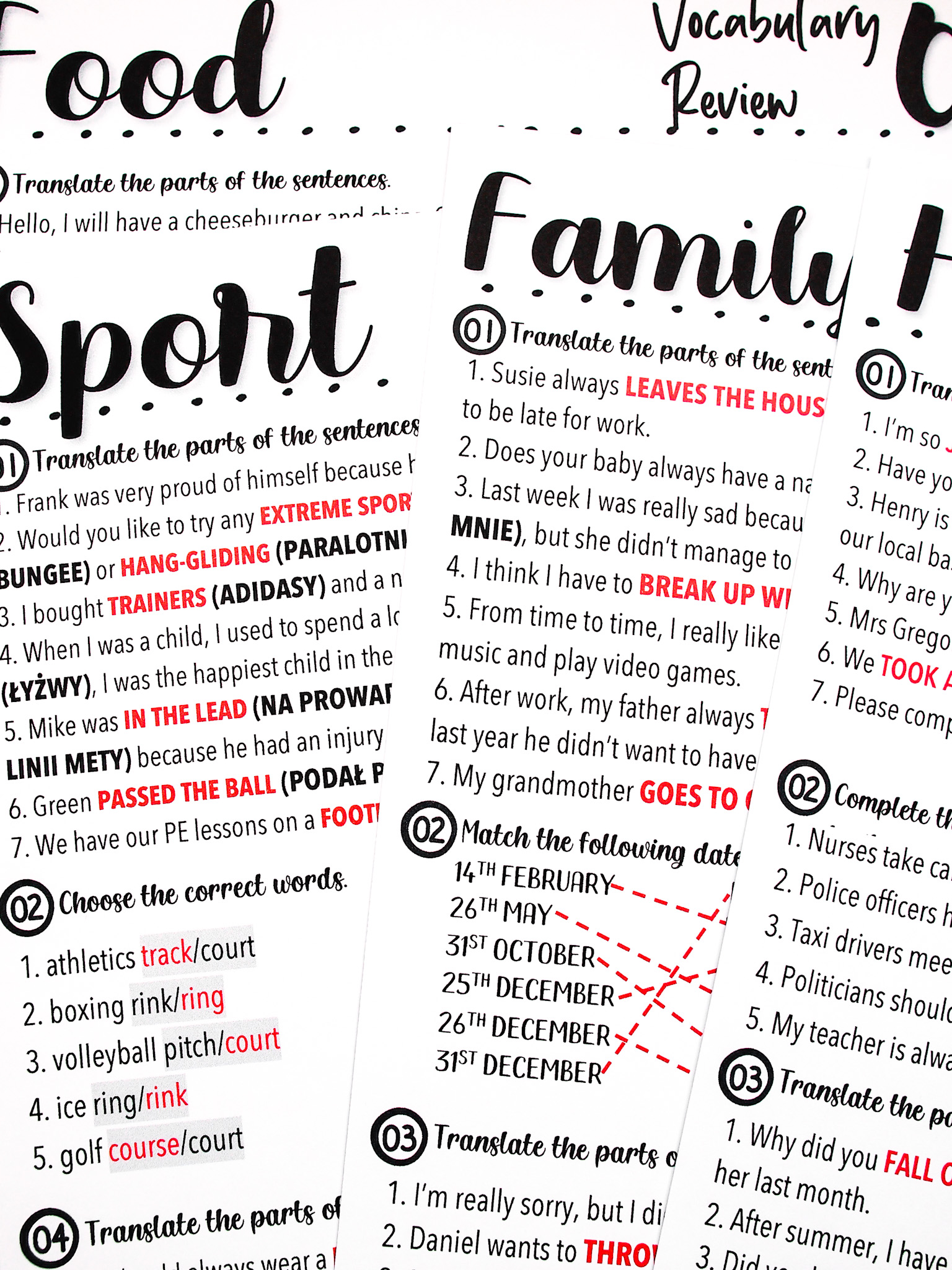 ◆ dictionary: w trzech wersjach (42 strony) – słownictwo po polsku, angielsku oraz w wersji dla nauczyciela,