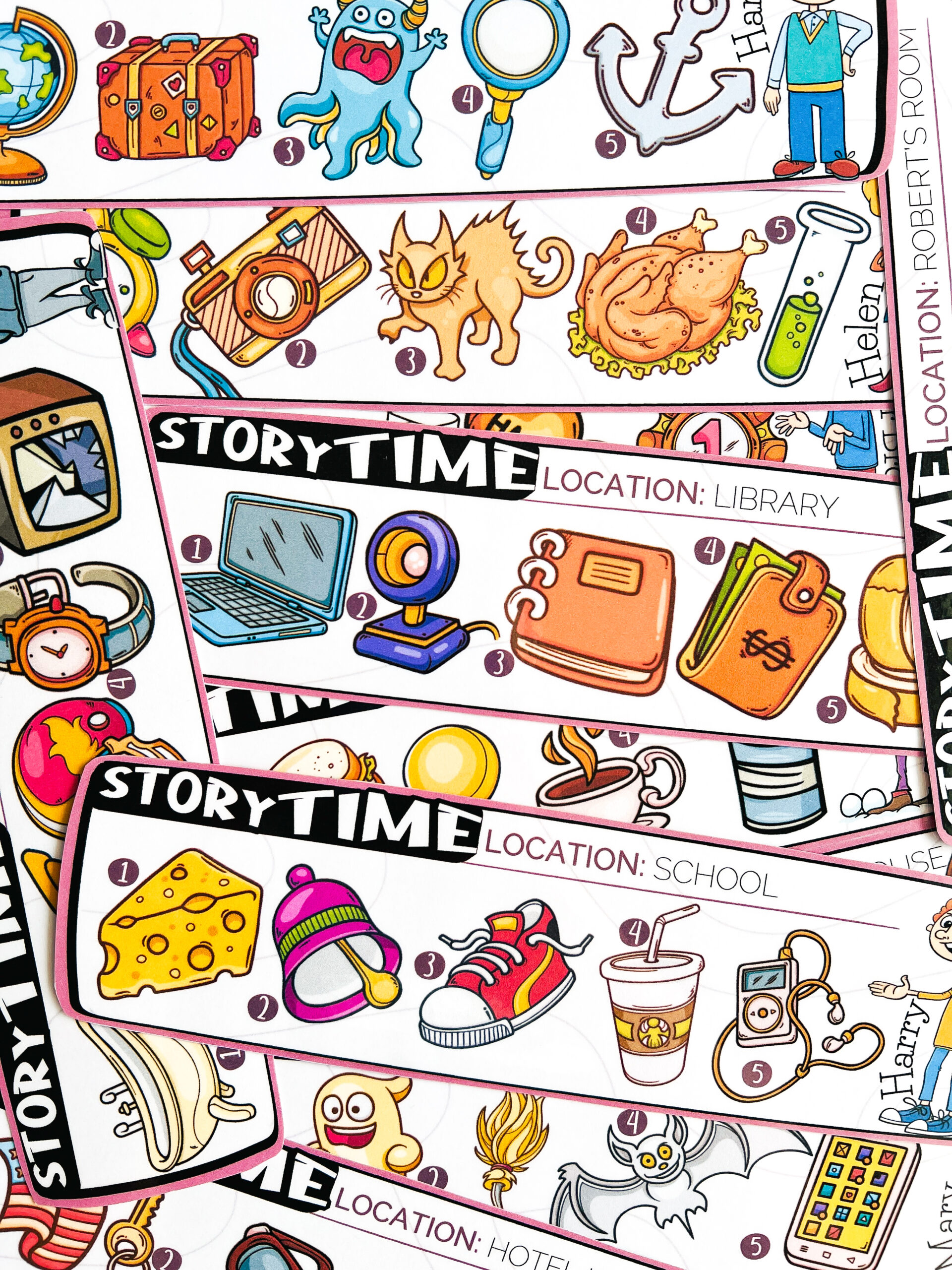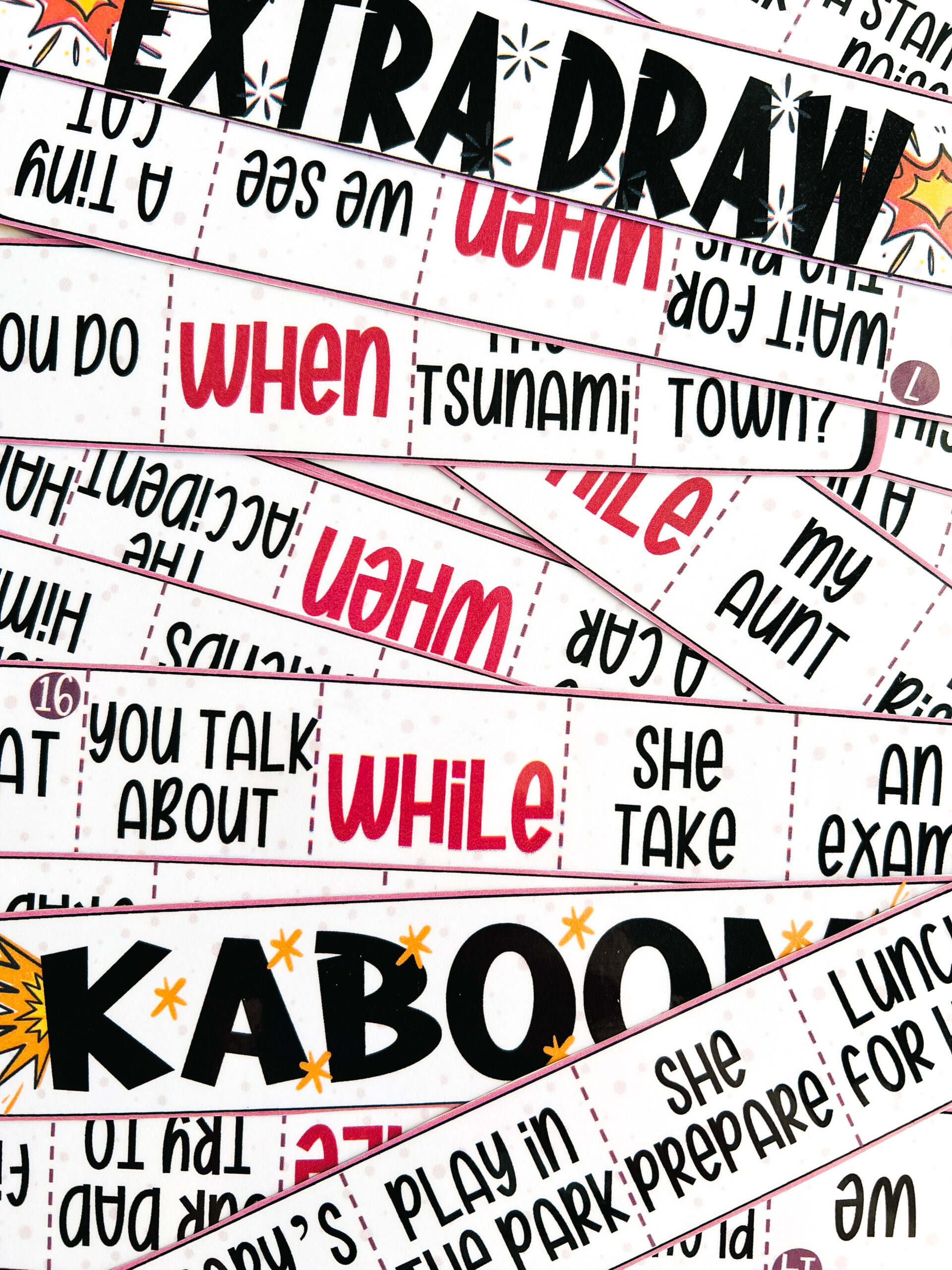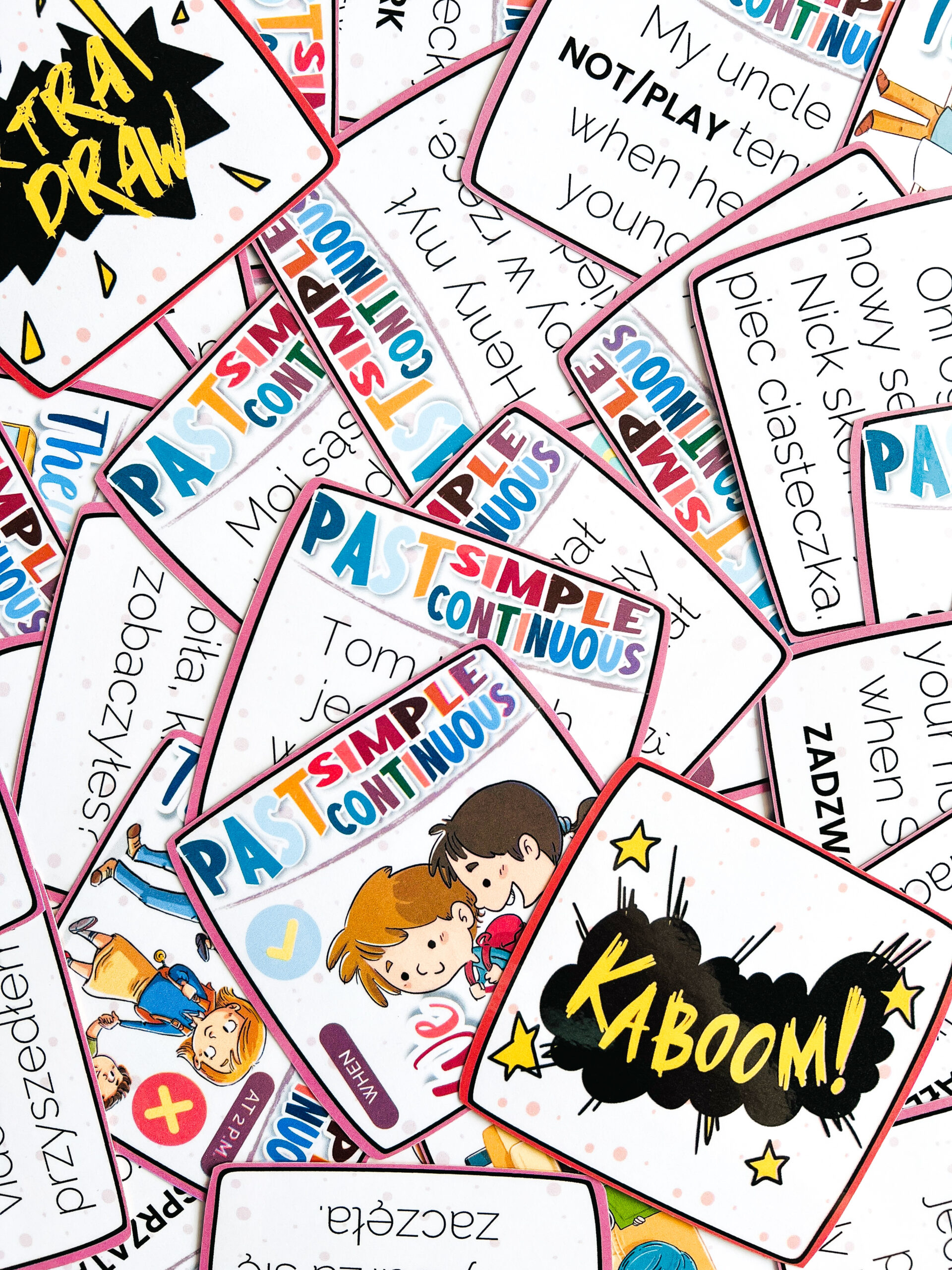 ◆ 8 gier:・Grammar Memory ⇢ 64 karty – 32 pary,・ Tic-Tac-Toe ⇢ 20 plansz,・Kaboom ⇢ 60 kart z różnymi typami zdań, 6 kart Kaboom oraz 6 kart ExtraDraw,・Kaboom Board Game ⇢ 12 pól funkcyjnych do gry planszowej,・Board Game ⇢ 3 różne plansze, ・Gold Winner ⇢ 96 kart oraz 6 kart funkcyjnych, ・Charades ⇢ 24 karty, ・Stripes (NOWOŚĆ!) ⇢ 24 karty, ・Story Time (NOWOŚĆ!) ⇢ 12 kart,