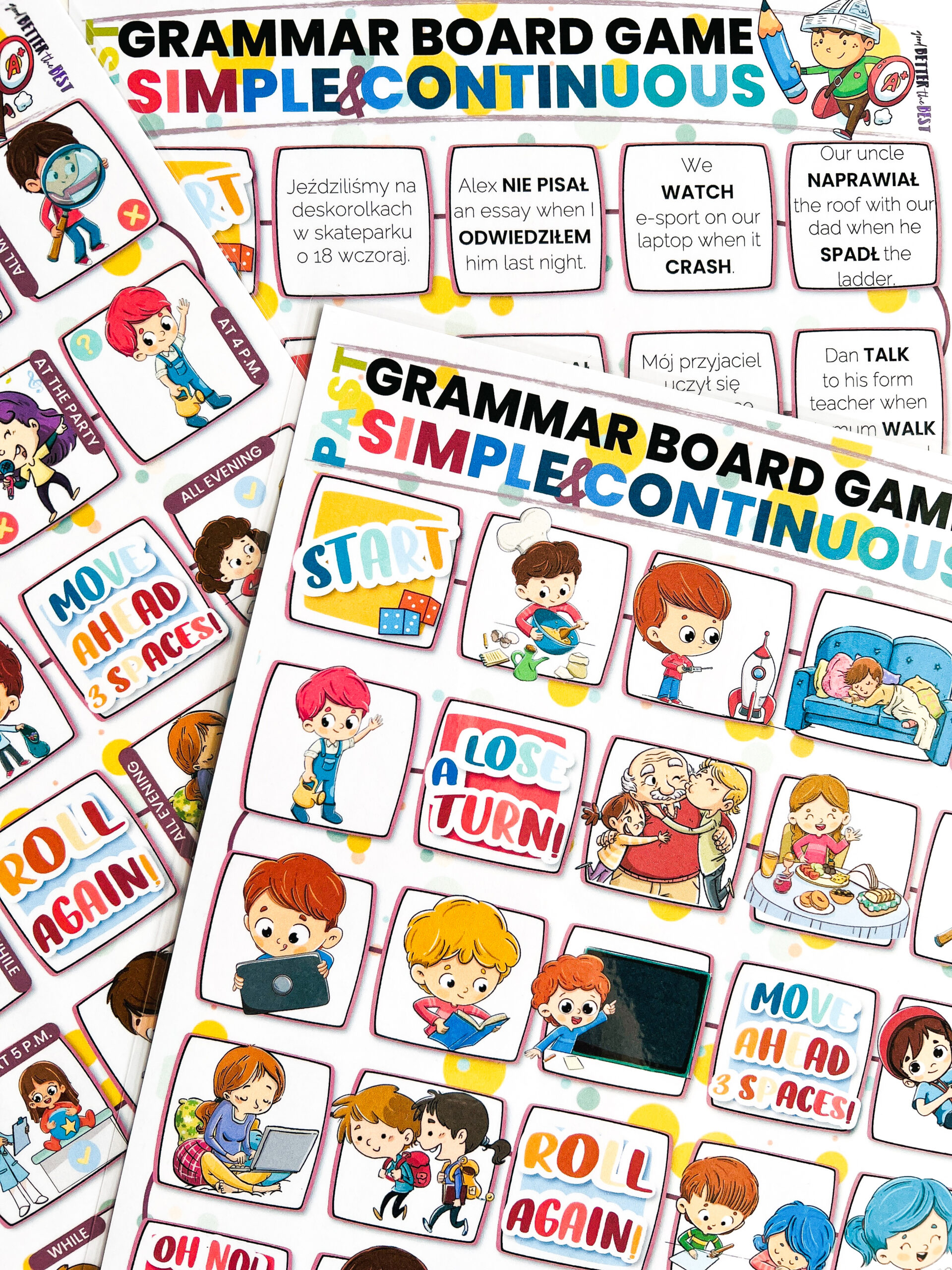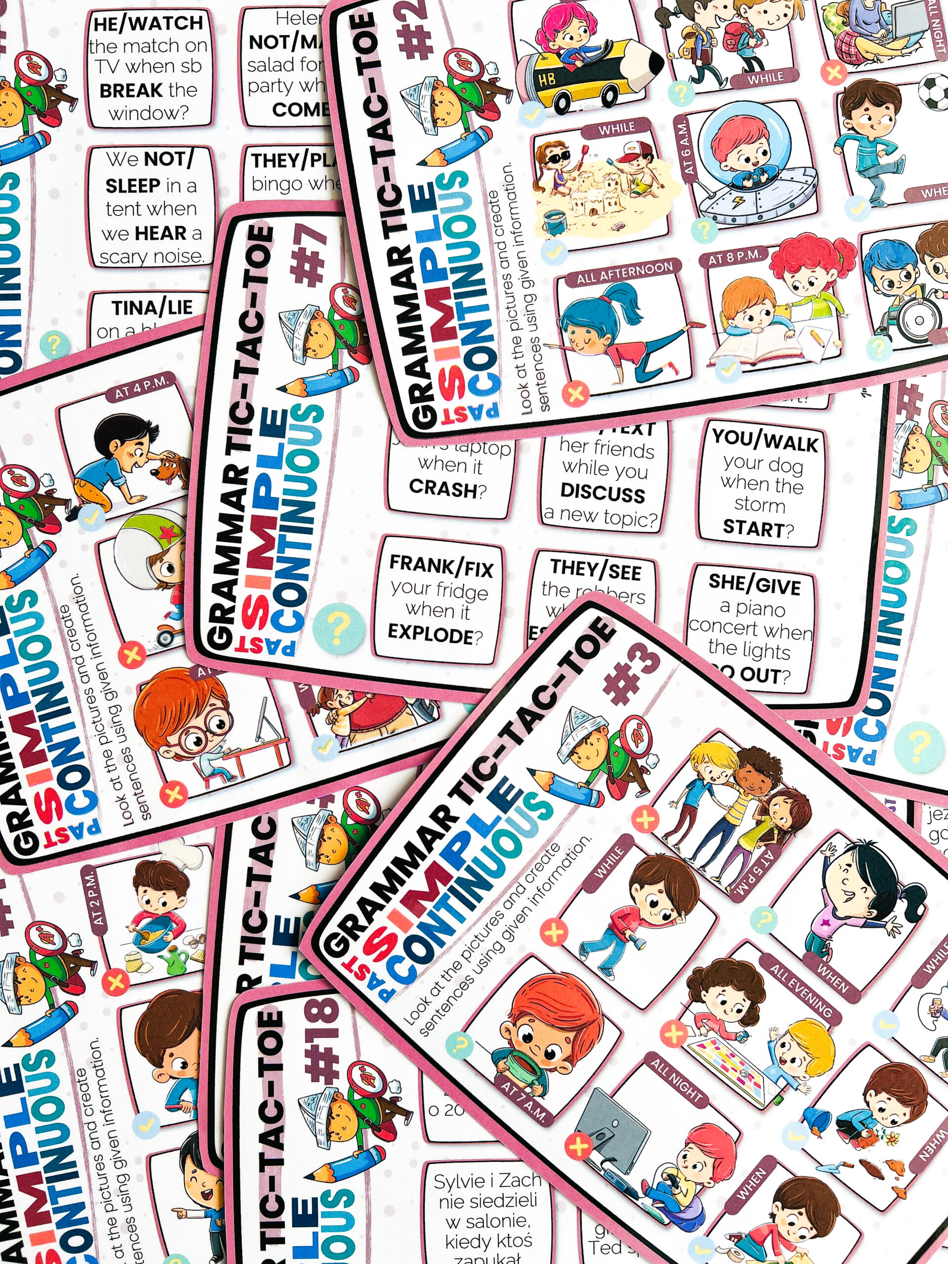 PAST SIMPLE & CONTINUOUS GRAMMAR&GAMES – zestaw przeznaczony do pracy z uczniami klas młodszych szkoły podstawowej oraz innymi na poziomie A1+/A2. W zestawie e-book z ćwiczeniami dla ucznia, książka z naniesionymi odpowiedziami dla nauczyciela, 8 gier oraz tło. Zestaw składa się z prawie 90 stron ćwiczeń oraz gotowych do druku gier. Po zakupie wysyłany jest plik PDF do samodzielnego wydruku.
