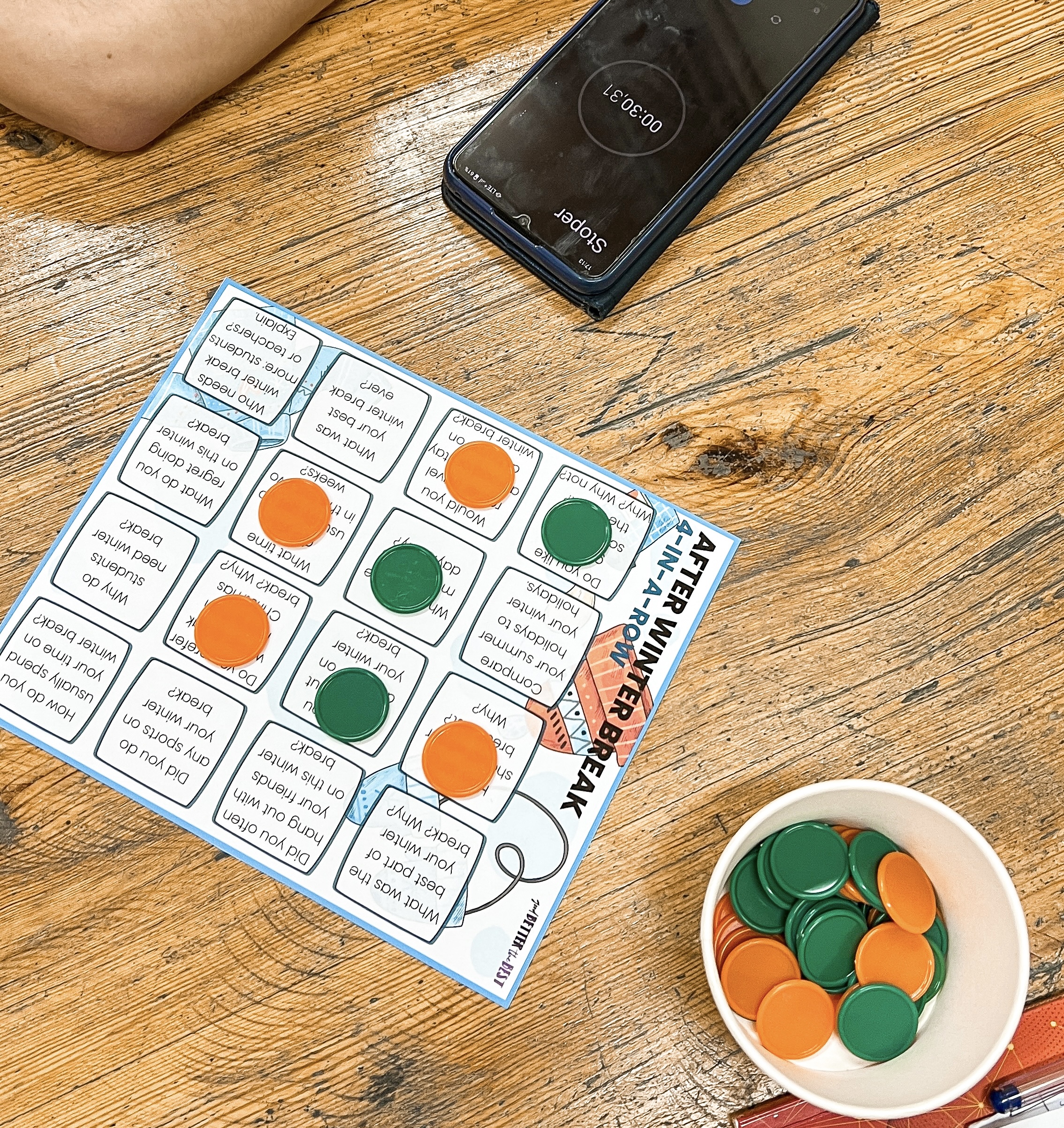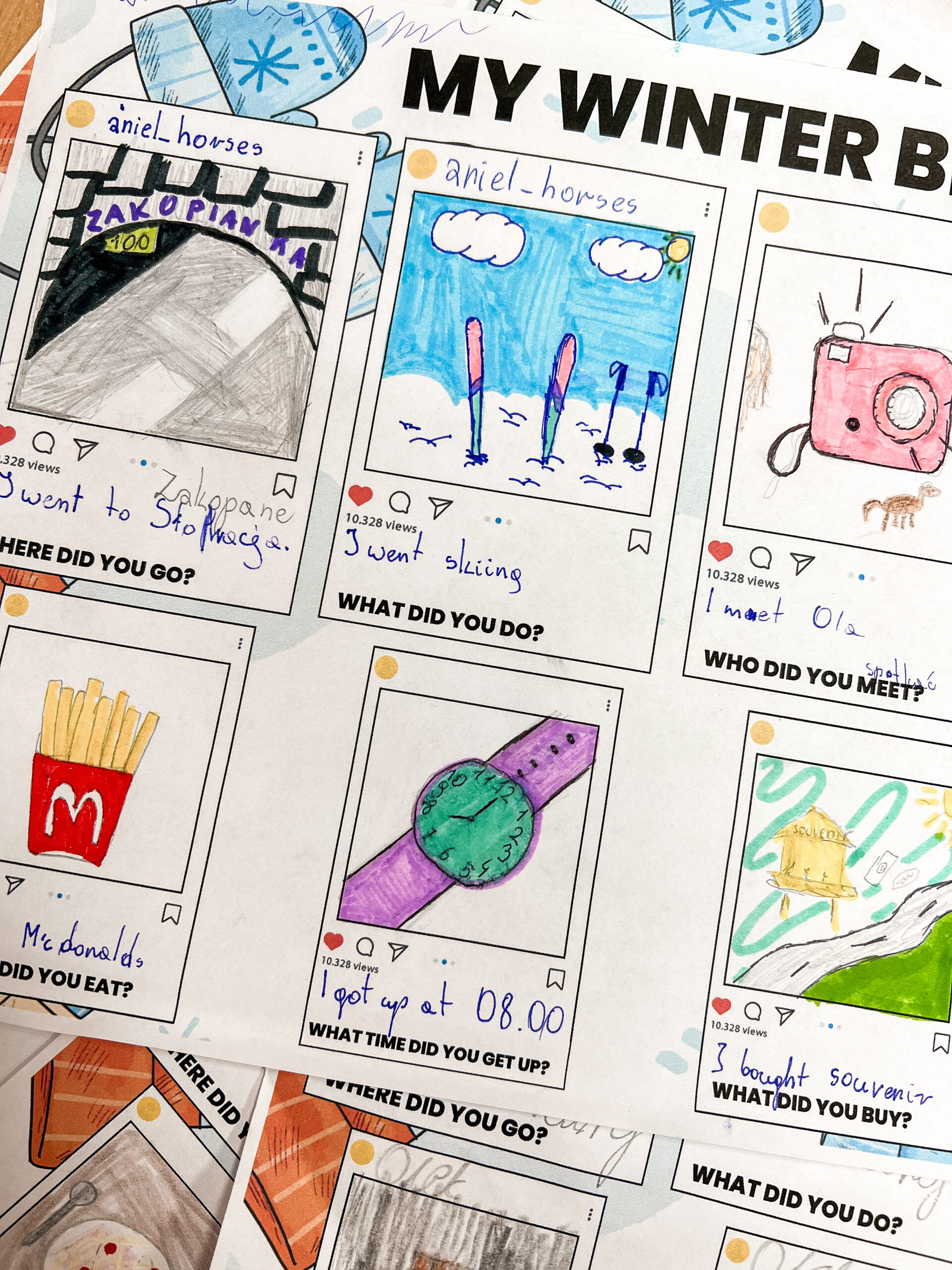 ◆ 4 kart pracy dla ucznia, ◆ 2 karty My Winter Break Posts,◆ 1 plansza do gry 4-in-a-row,