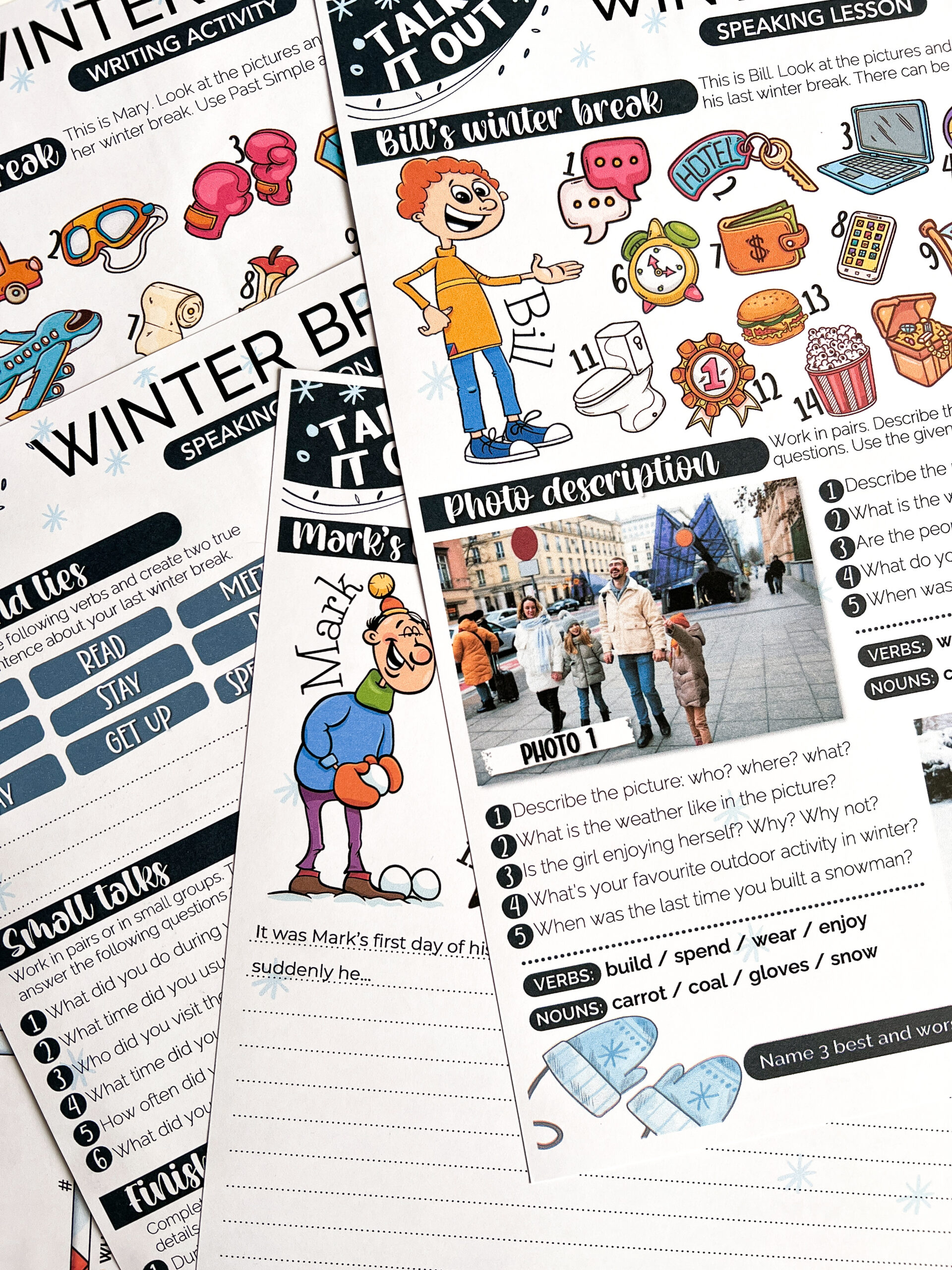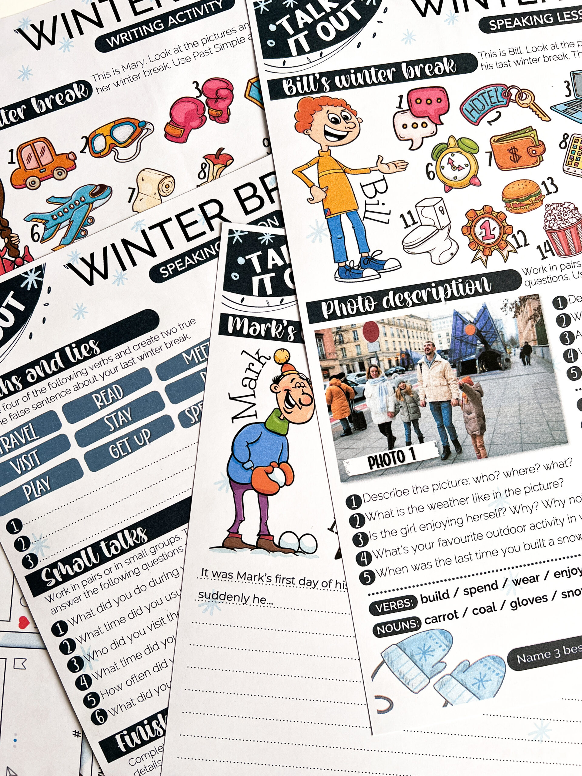 TALK IT OUT: WINTER BREAK– zestaw przeznaczony do pracy z uczniami klas młodszych szkoły podstawowej oraz innymi grupami, które poznały już czas Past Simple. W zestawie e-book z ćwiczeniami dla ucznia, My winter break posts oraz 4-in-a-row. Po zakupie wysyłany jest plik PDF do samodzielnego wydruku.